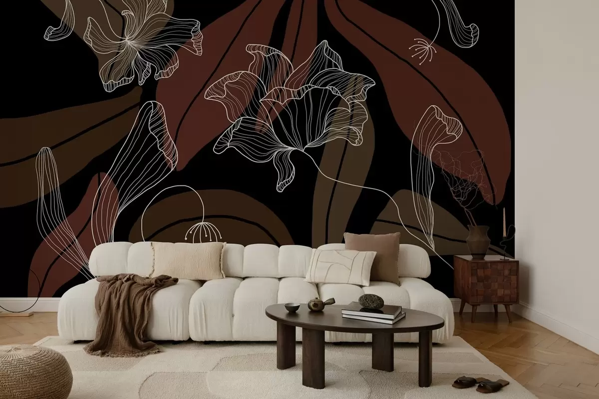 Fototapetak absztrakt levelek és virágok púderes és bézs árnyalatokban sötét háttér előtt Nr. w04499v3