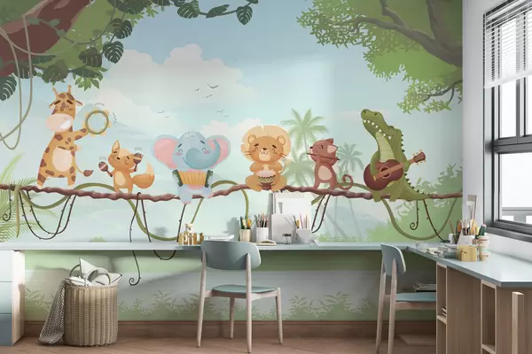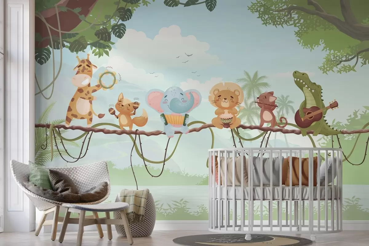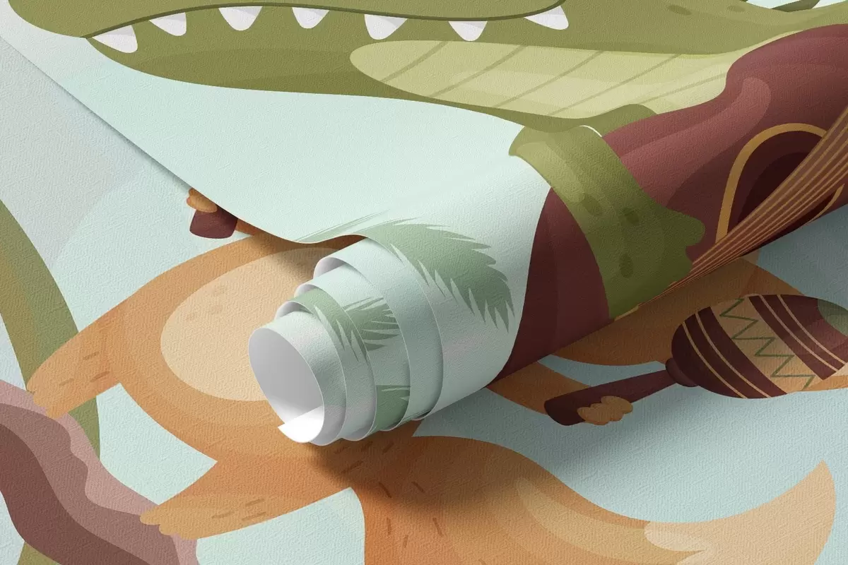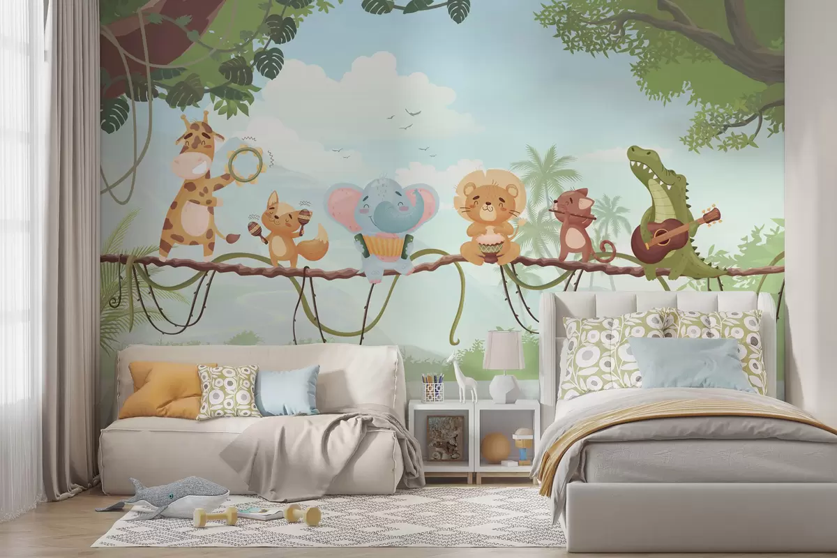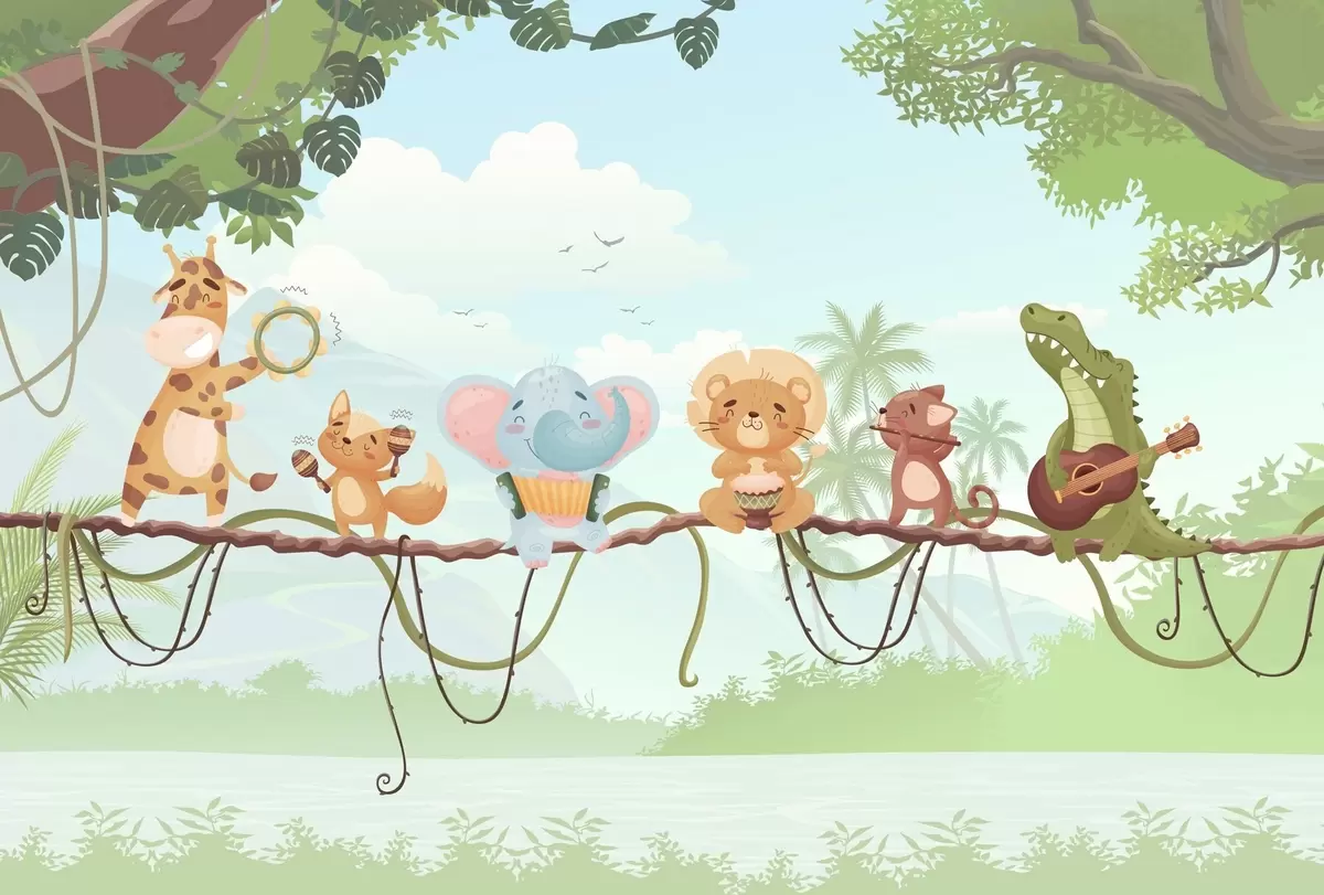 Fototapetak Hangszerekkel játszó állatok trópusi táj előtt Nr. w04505