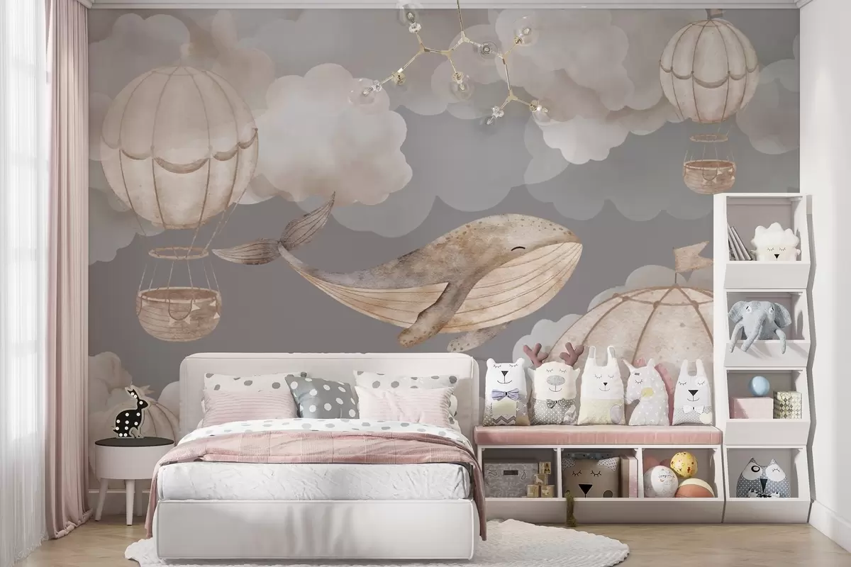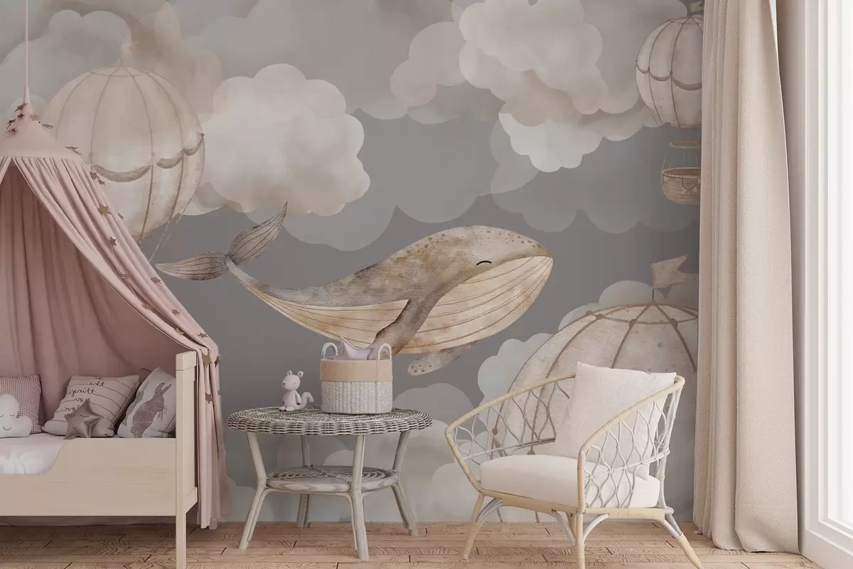 Fototapetak Bálna és hőlégballonok puha felhők között Nr. w04522