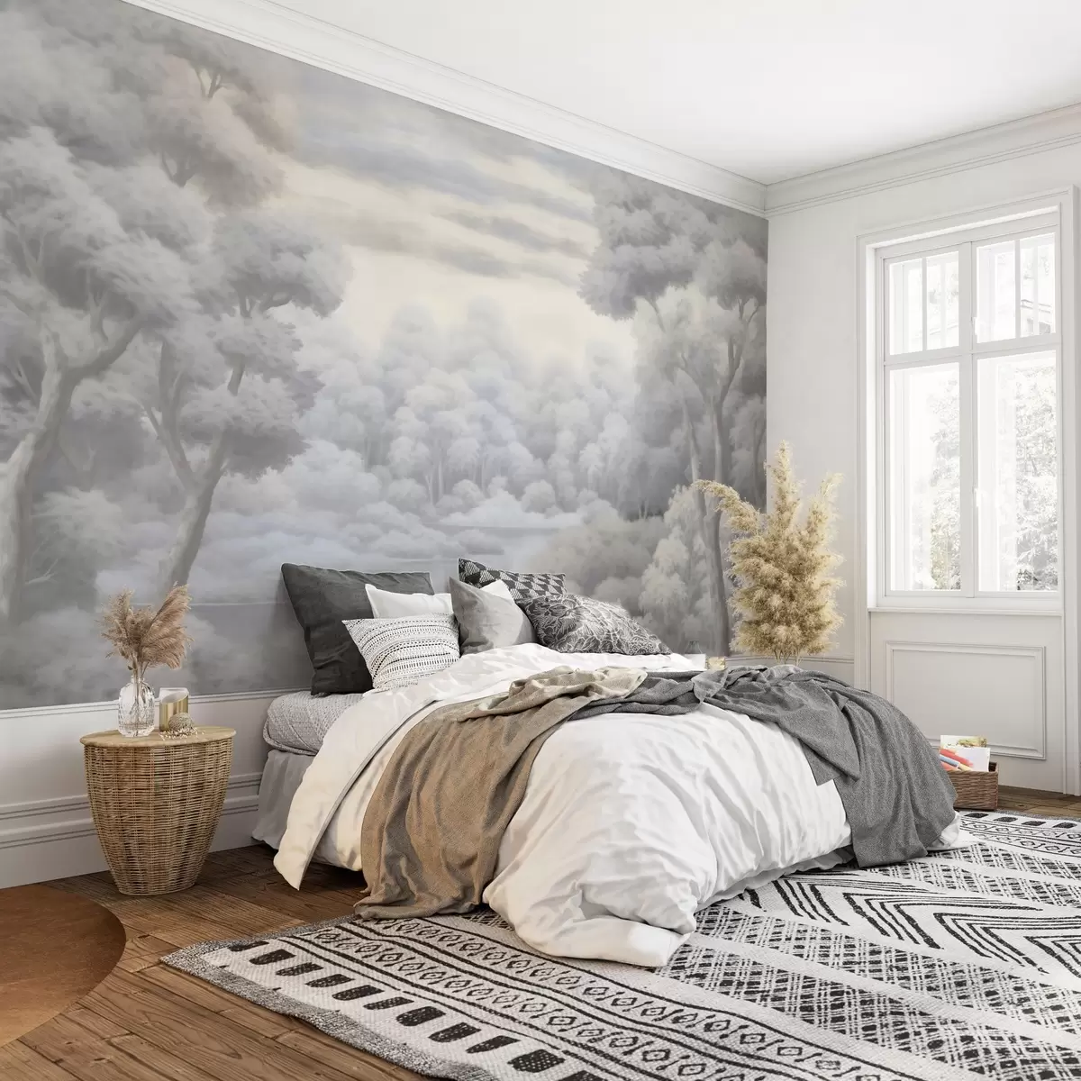 Fototapetak Ködös erdő és tó lágy szürke árnyalatokban Nr. w04617