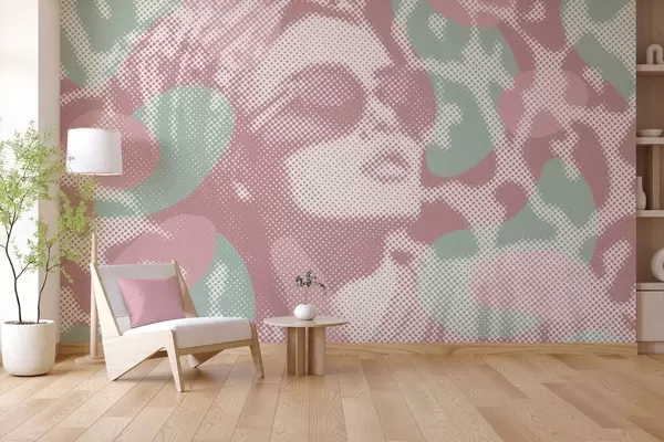 Fototapetak nő portréja leopárd háttér előtt, pöttyös stílusban, rózsaszín és zöld árnyalatokban Nr. w04630v2