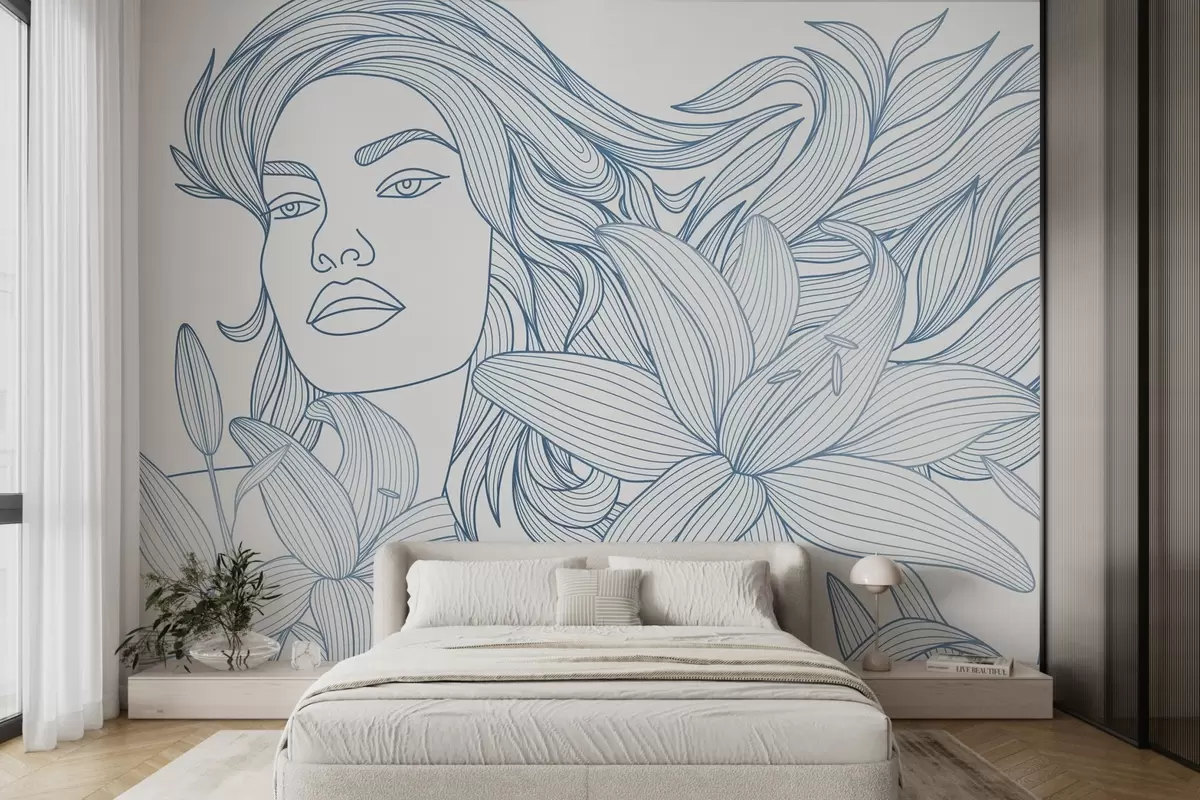 Fototapetak Kék árnyalatú liliomvirágok között álló lány portréja Nr. w04689v2