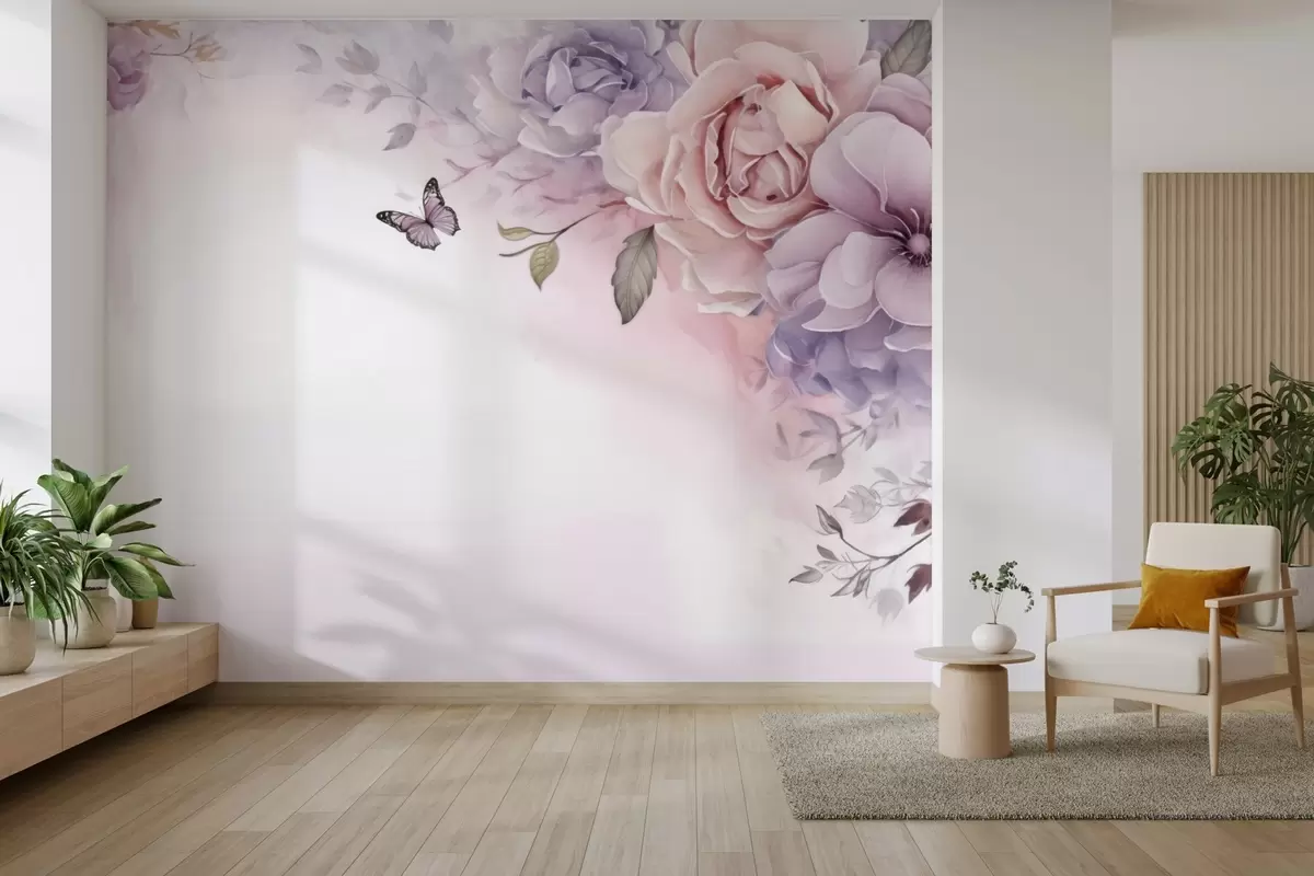 Fototapetak Finom rózsaszín és lila virágok pillangóval Nr. w04711