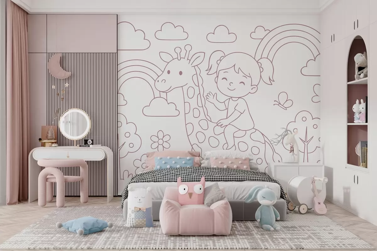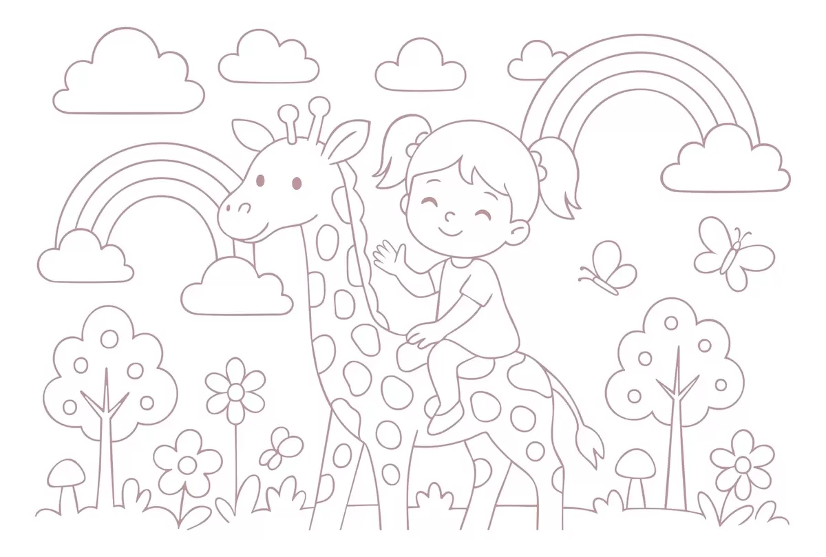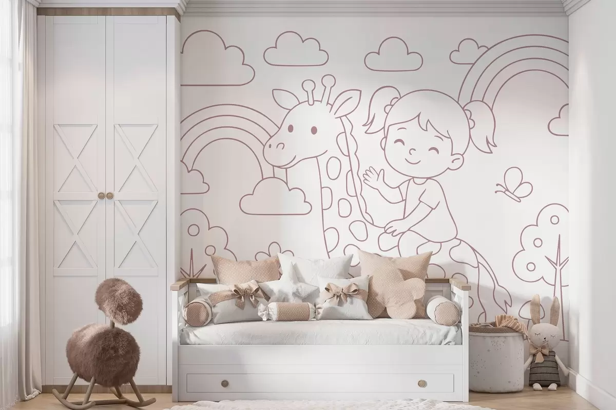 Fototapetak porfestés egy zsiráfon ülő lányról, gyermekek számára készült kifestőkönyv stílusában Nr. w04753v1