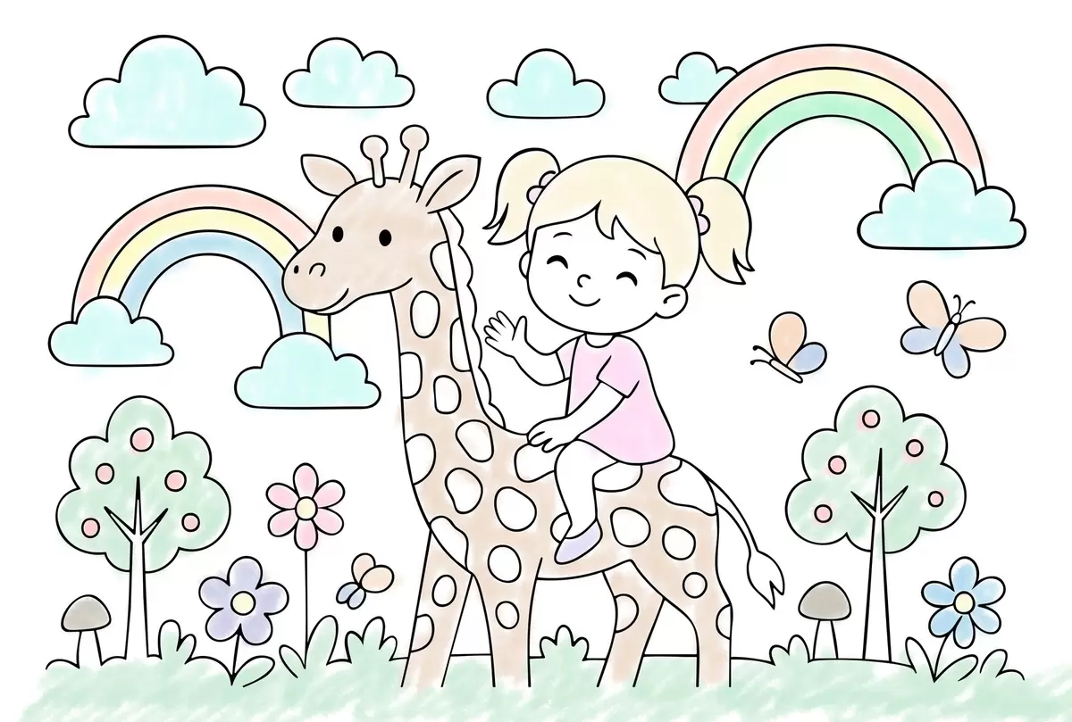 Fototapetak gyerekek színezőkönyvének stílusában készült, zsiráfon ülő kislány Nr. w04755