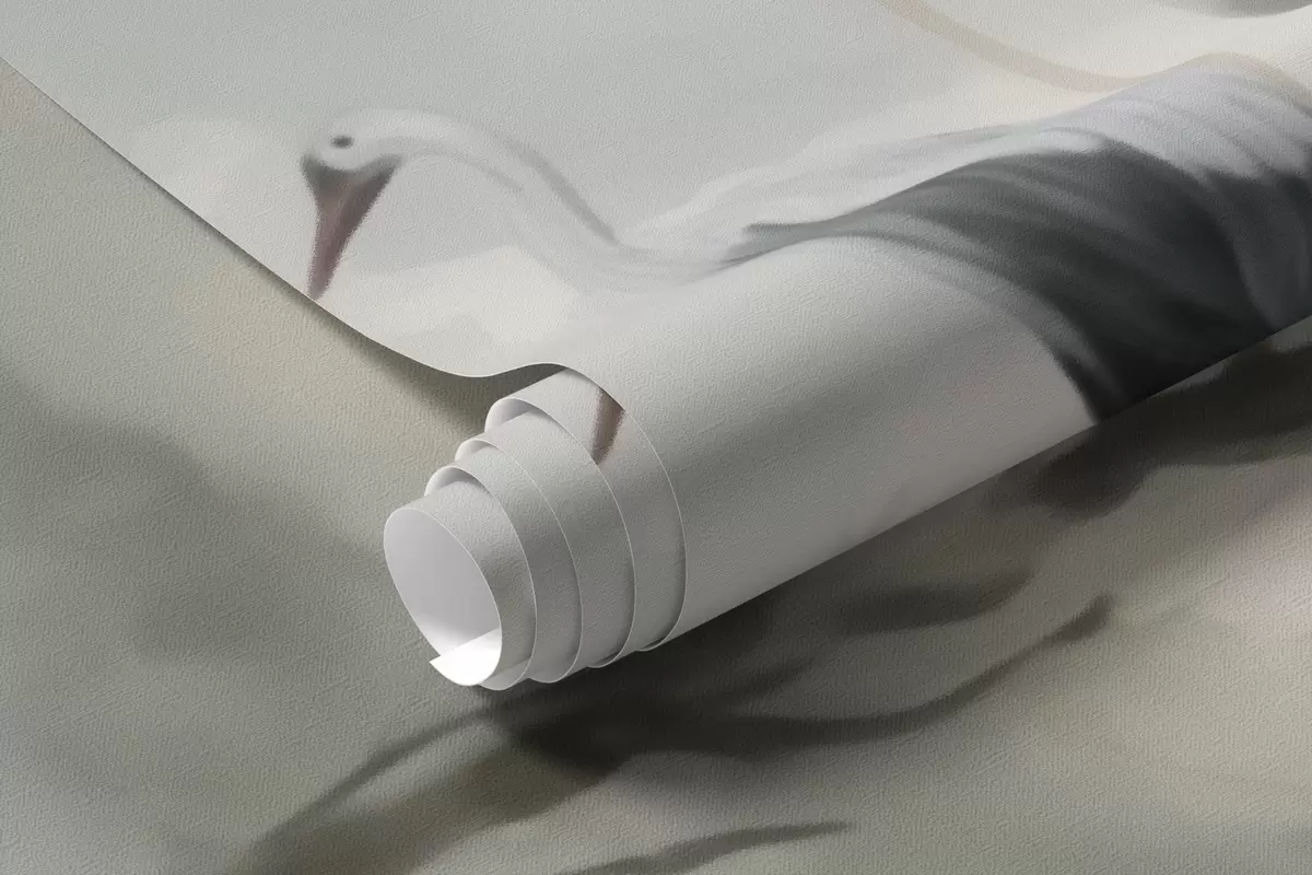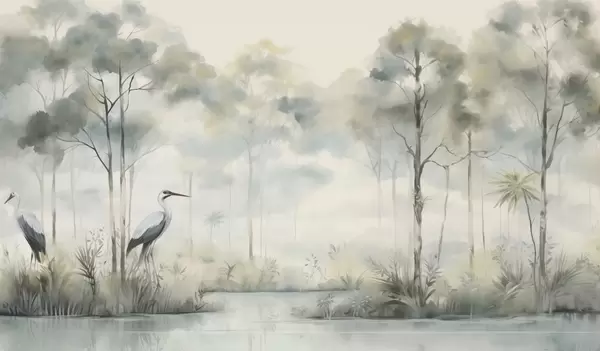 Fototapetak Ködös erdő a víz mellett, gémekkel, lágy, hűvös színpalettával Nr. w04788