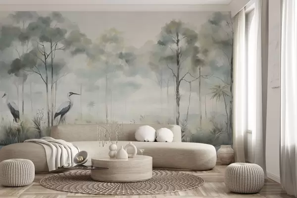 Fototapetak Ködös erdő a víz mellett, gémekkel, lágy, hűvös színpalettával Nr. w04788