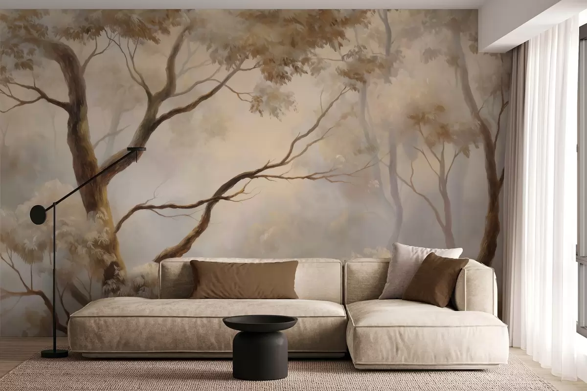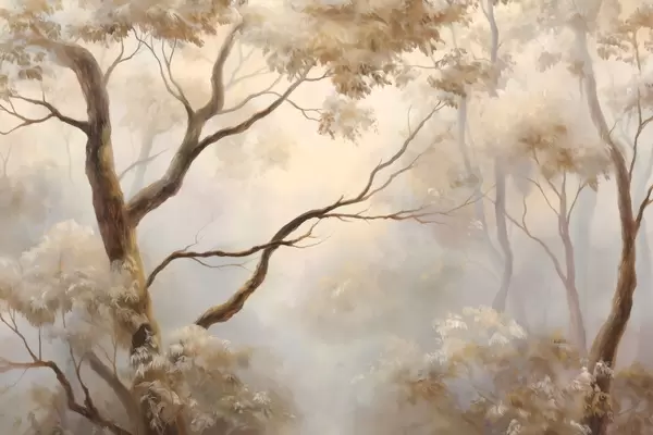 Fototapetak Az erdő a reggeli ködben. Finom hangulatú festmény művészi tájkép stílusban. Nr. w04817