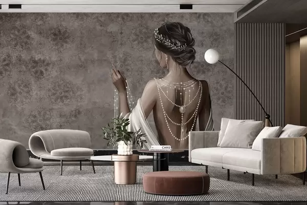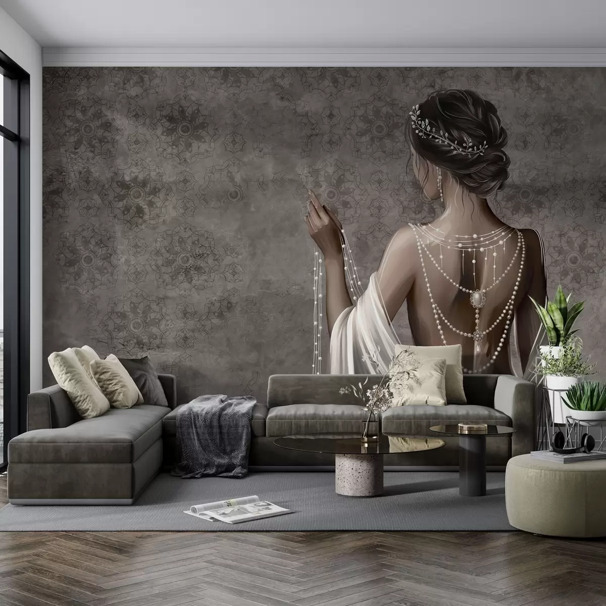 Fototapetak Hátulról látható nő gyöngyökkel, szürke kőmintás háttérrel Nr. w04854