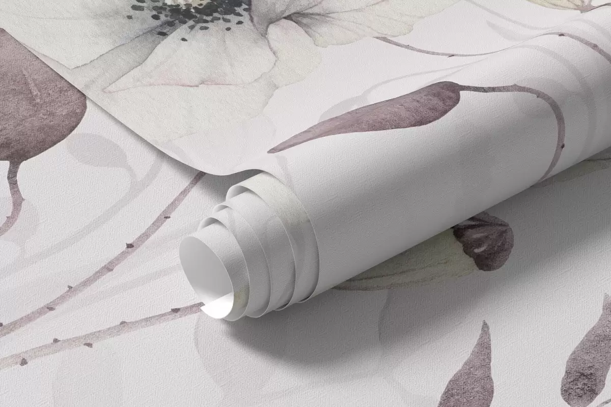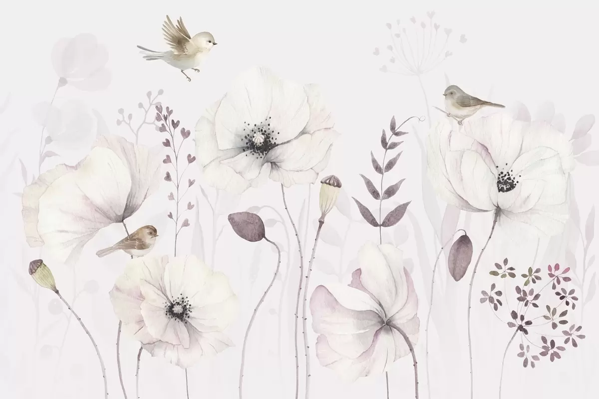 Fototapetak Akvarell pipacsok kis madarakkal, lágy lila színben Nr. w04861