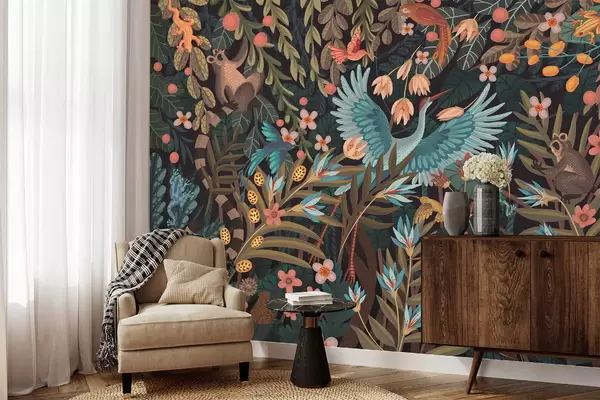 Fototapetak Fantázia jelenet madarakkal és állatokkal növények között Nr. w05024