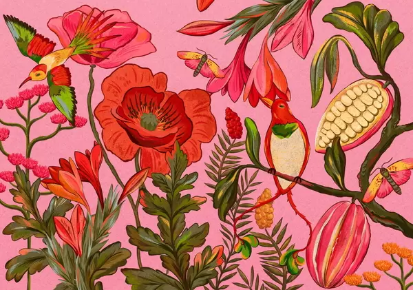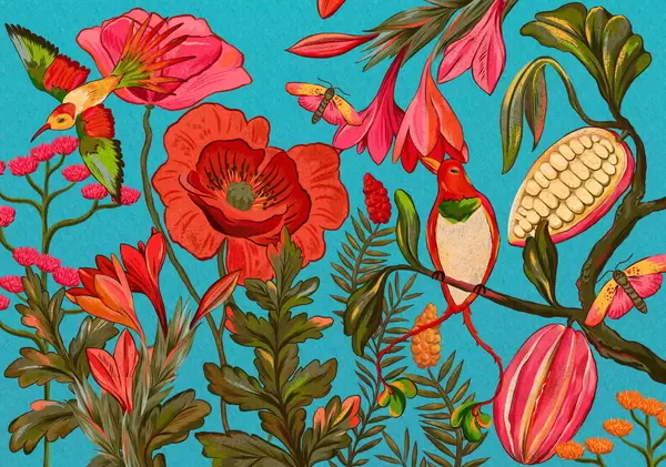 Fototapetak Dekoratív virágok és madarak kék háttérrel Nr. w05036