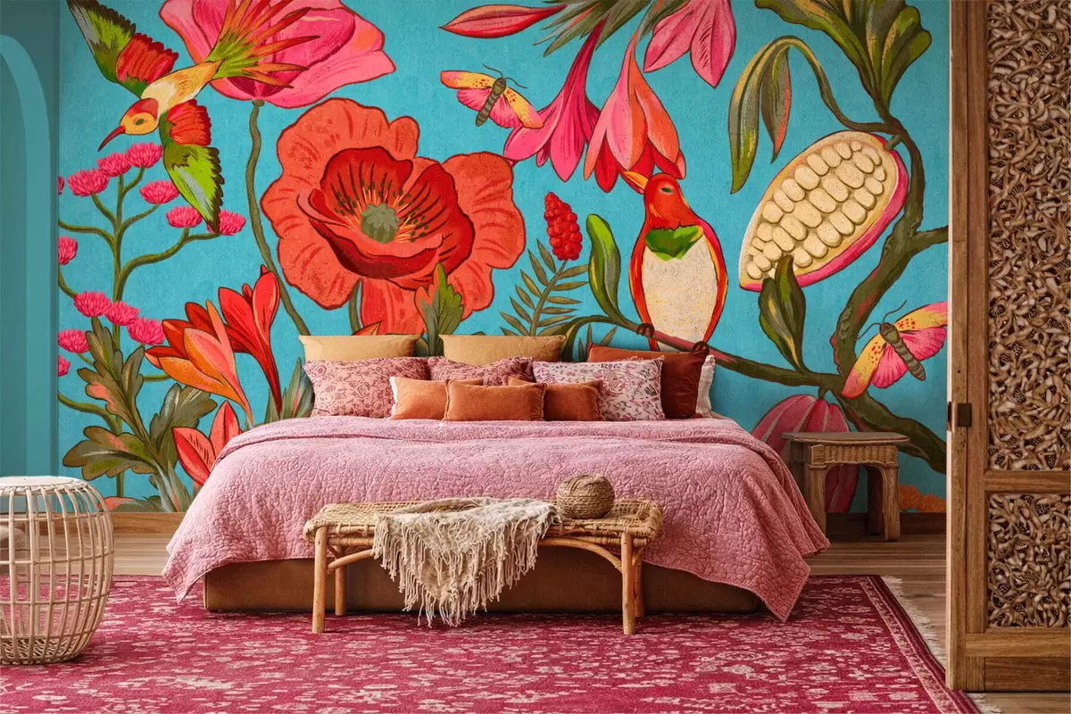 Fototapetak Dekoratív virágok és madarak kék háttérrel Nr. w05036v3
