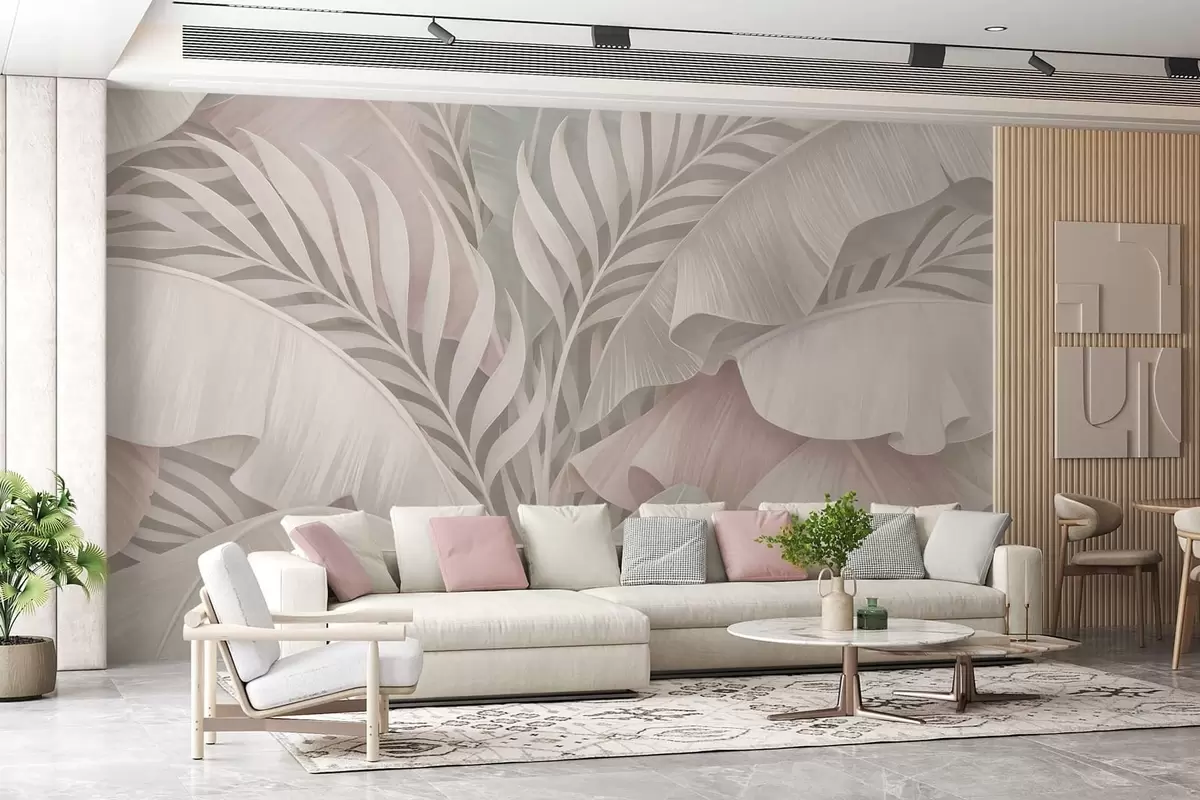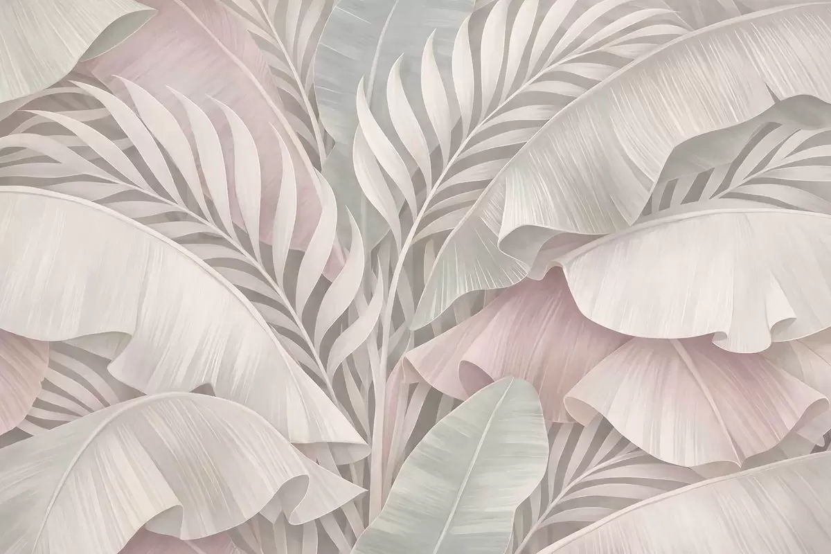 Fototapetak nagy trópusi levelek hűvös rózsaszín és szürke árnyalatokban Nr. w05062v1