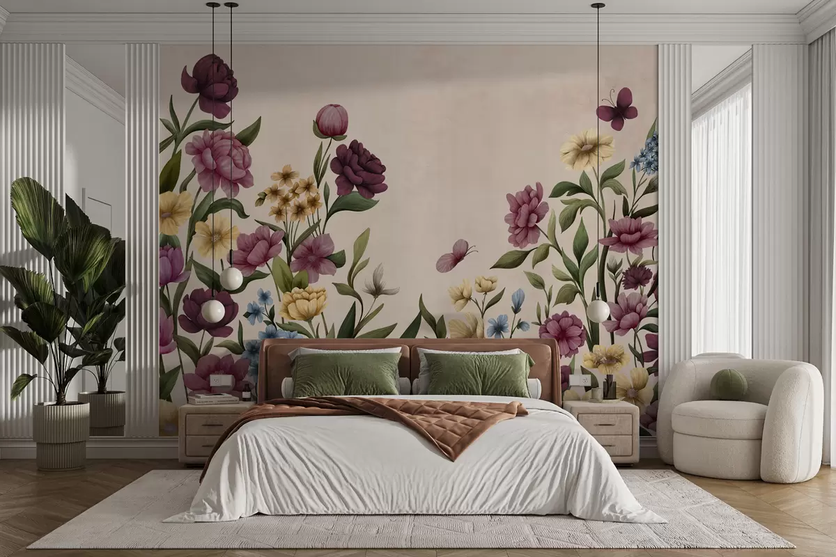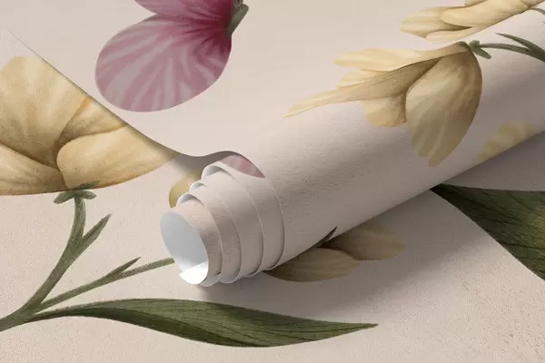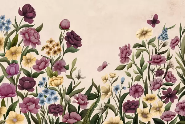 Fototapetak Virágkompozíció növényekkel és lepkékkel világos háttér előtt Nr. w05072