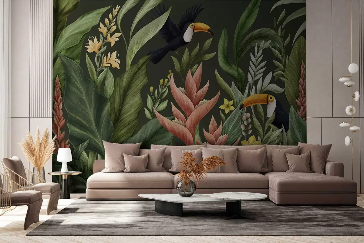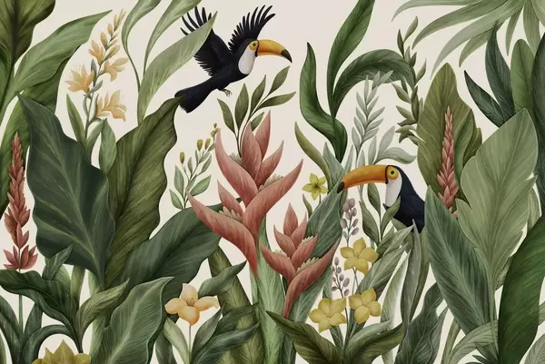 Fototapetak Trópusi növények és nagycsőrű madarak világos háttér előtt Nr. w05088