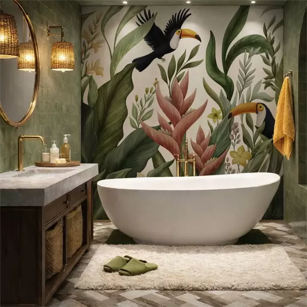 Fototapetak Trópusi növények és nagycsőrű madarak világos háttér előtt Nr. w05088v1