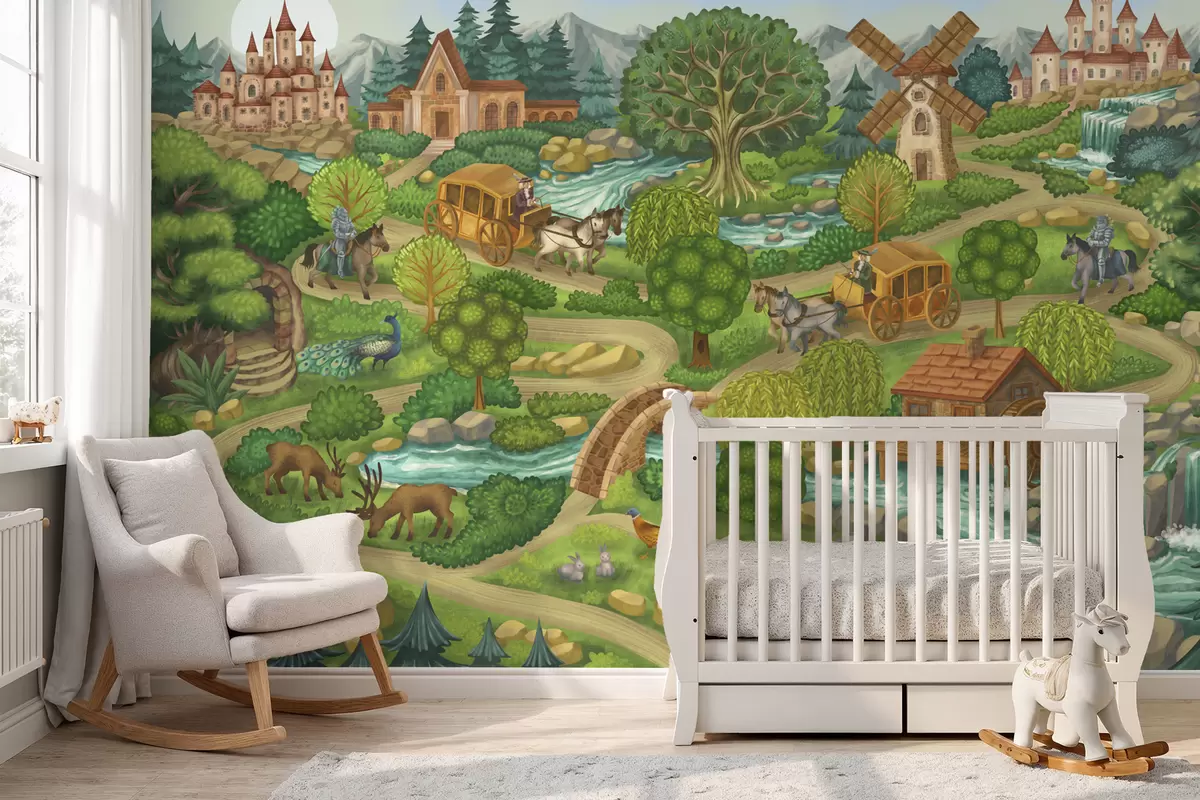 Fototapetak Tündér illusztráció kastélyokkal, erdővel, folyókkal és utazókkal Nr. w05091v1