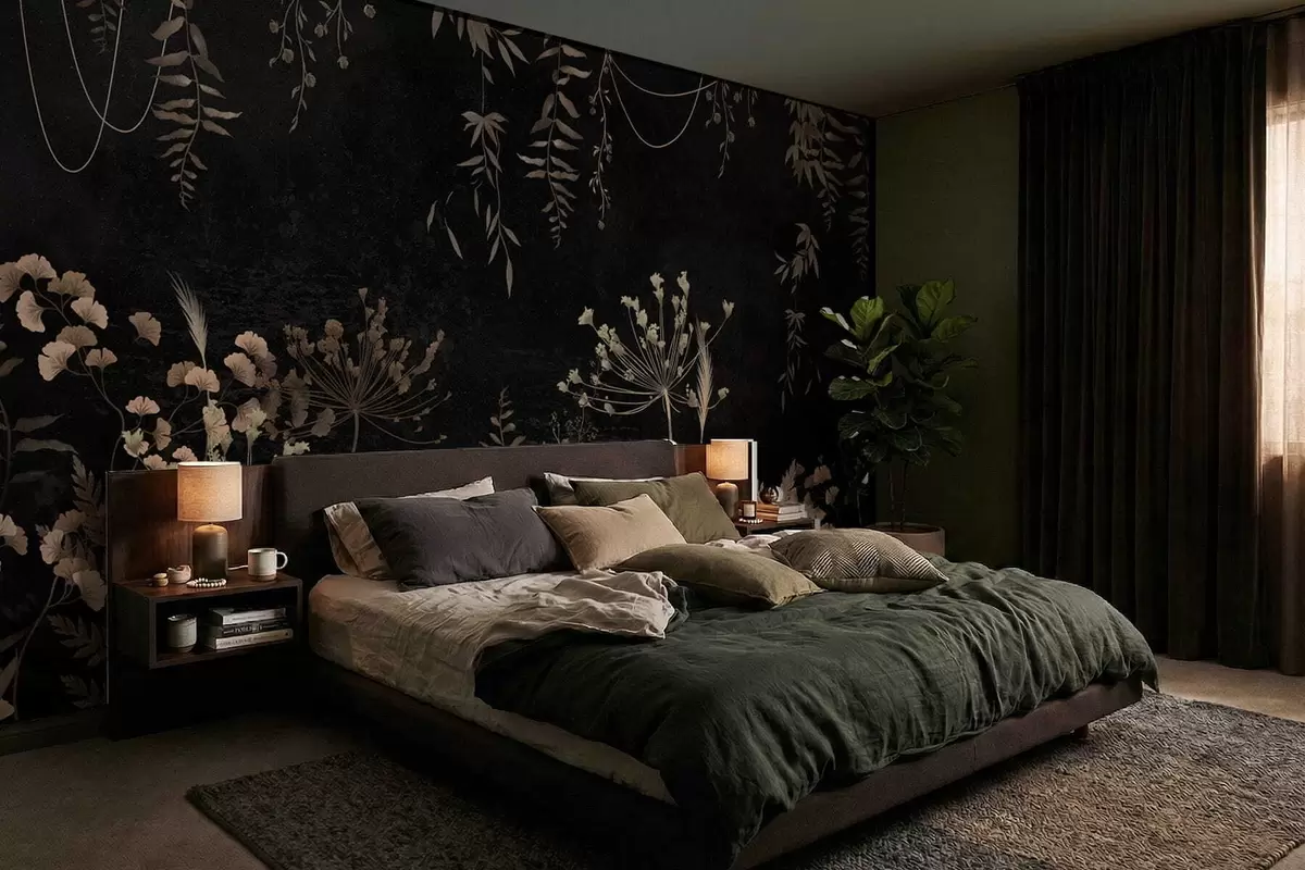 Fototapetak Sötét botanikai mintázat virágokkal és levelekkel Nr. w05092