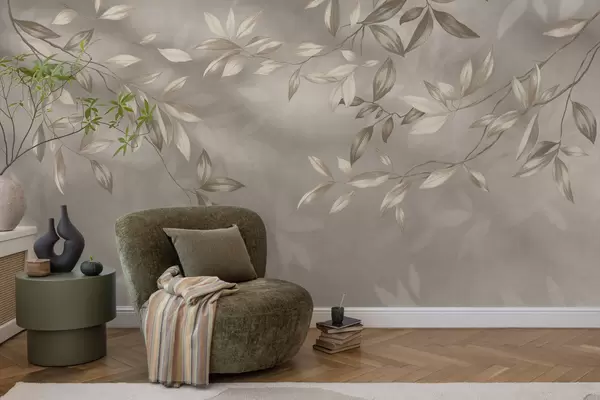 Fototapetak Elegáns, bézs árnyalatú, leveles ágak világos háttér előtt Nr. w05113