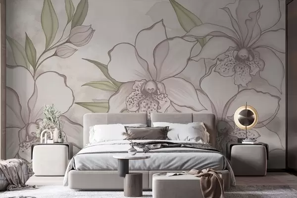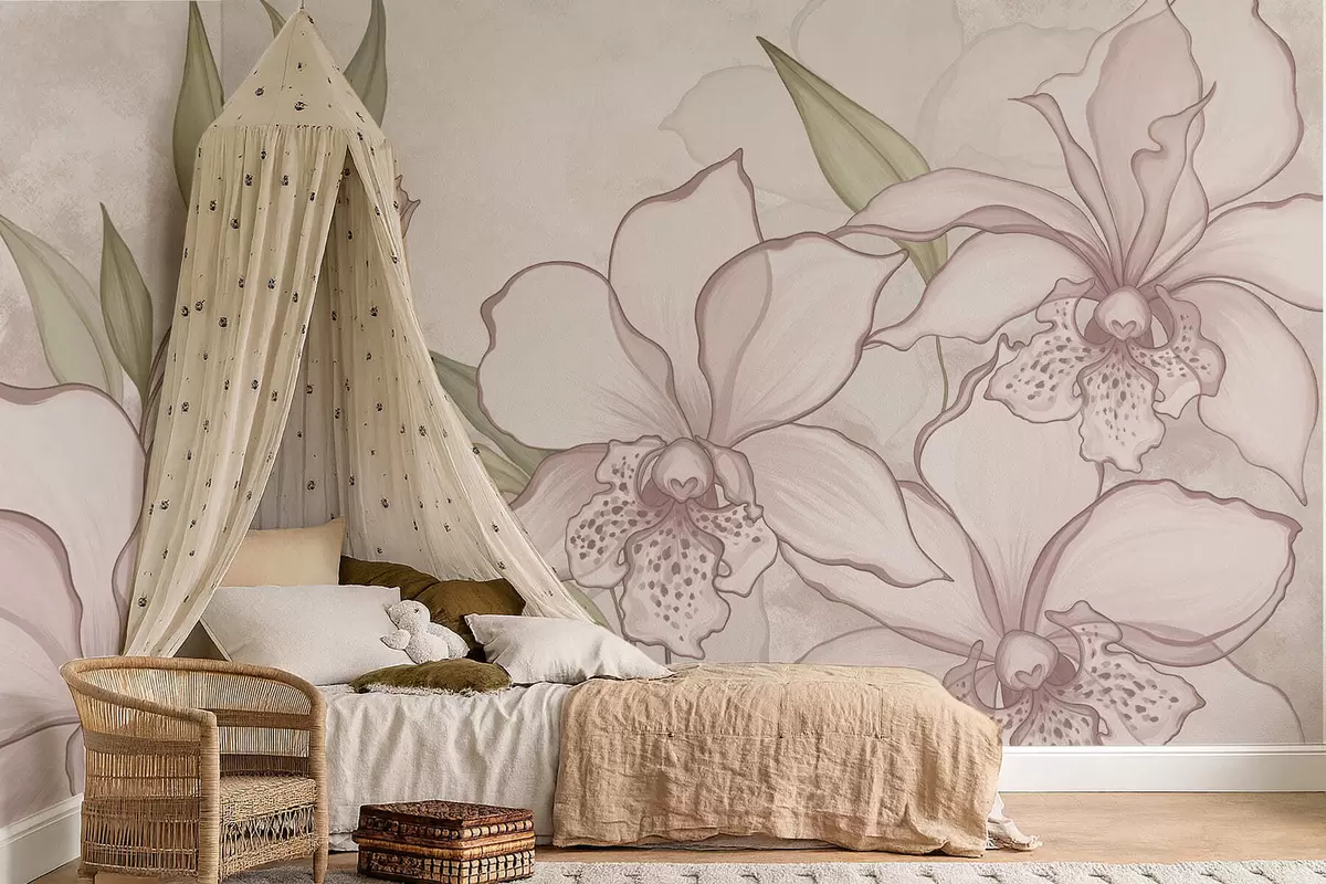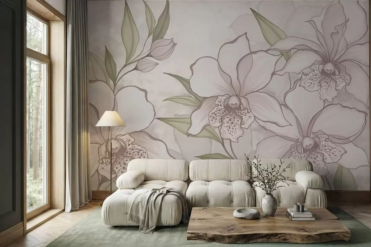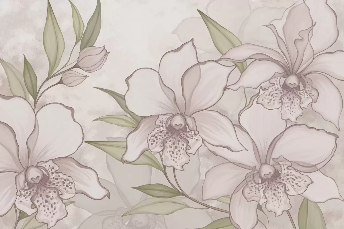 Fototapetak Halvány orchideák illusztrációja levelekkel bézs háttér előtt Nr. w05117