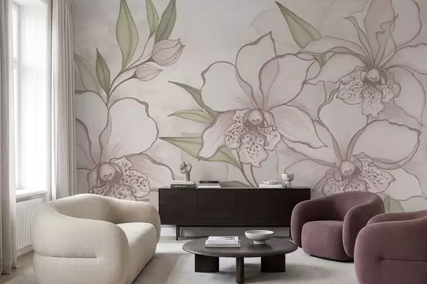 Fototapetak Halvány orchideák illusztrációja levelekkel bézs háttér előtt Nr. w05117