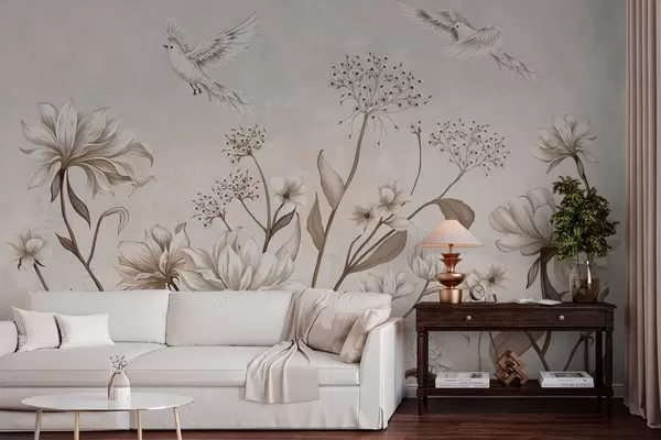 Fototapetak Könnyed virágok és madarak lágy háttér előtt Nr. w05118