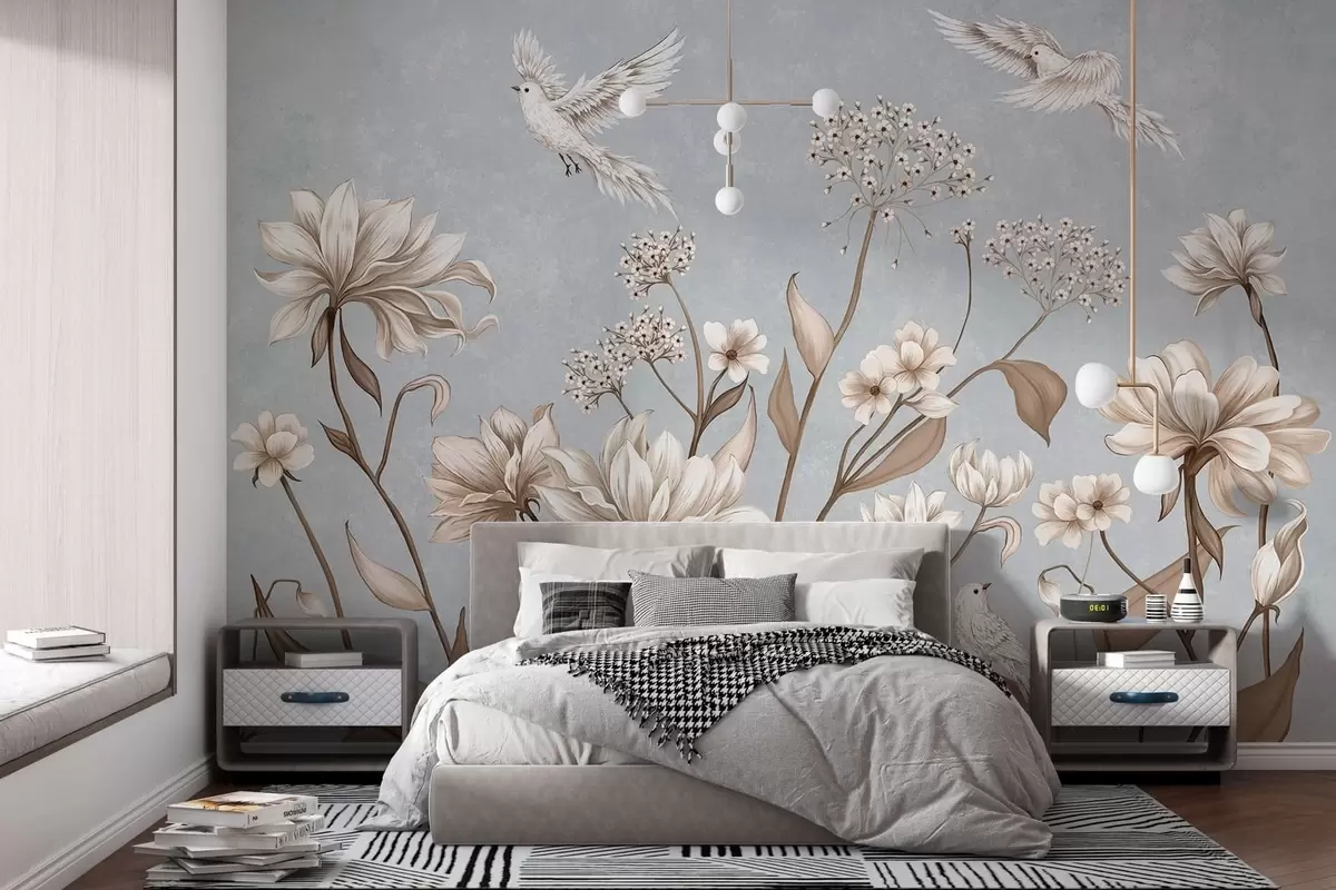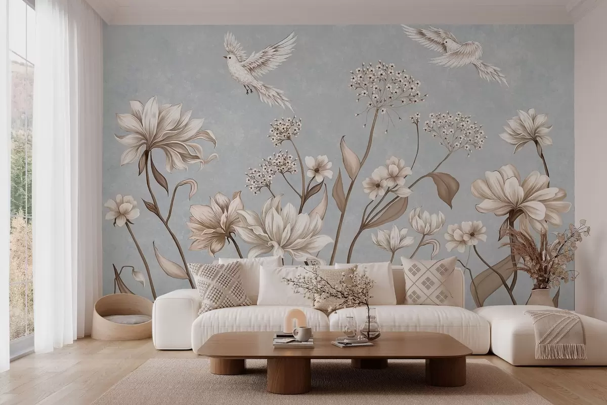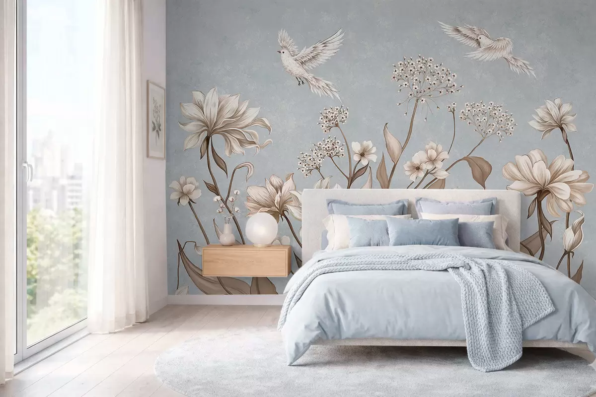 Fototapetak Virágok és madarak hűvös szürke-kék háttér előtt Nr. w05118v2