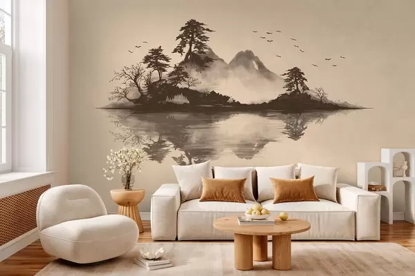 Fototapetak Sumi-e hegyi tájkép fenyőkkel és tükörképekkel Nr. w05124