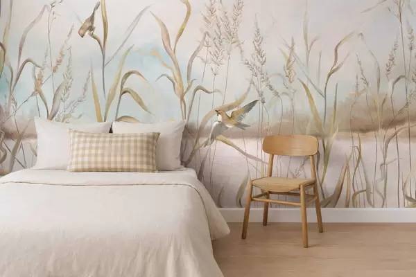Fototapetak Nádas és madarak illusztrációja víz mellett, lágy tónusokban Nr. w05125