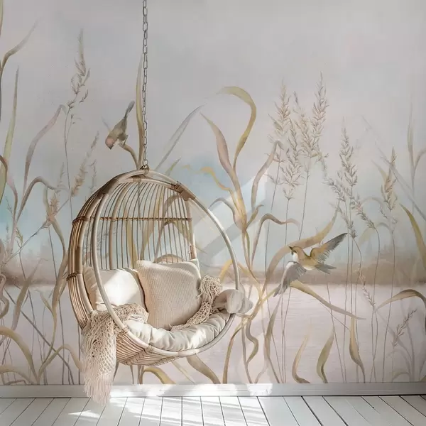 Fototapetak Nádas és madarak illusztrációja víz mellett, lágy tónusokban Nr. w05125