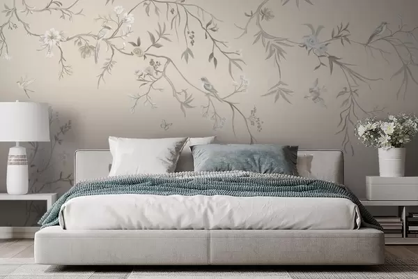Fototapetak Virágos ágak madarakkal világos háttér előtt Nr. w05127v7