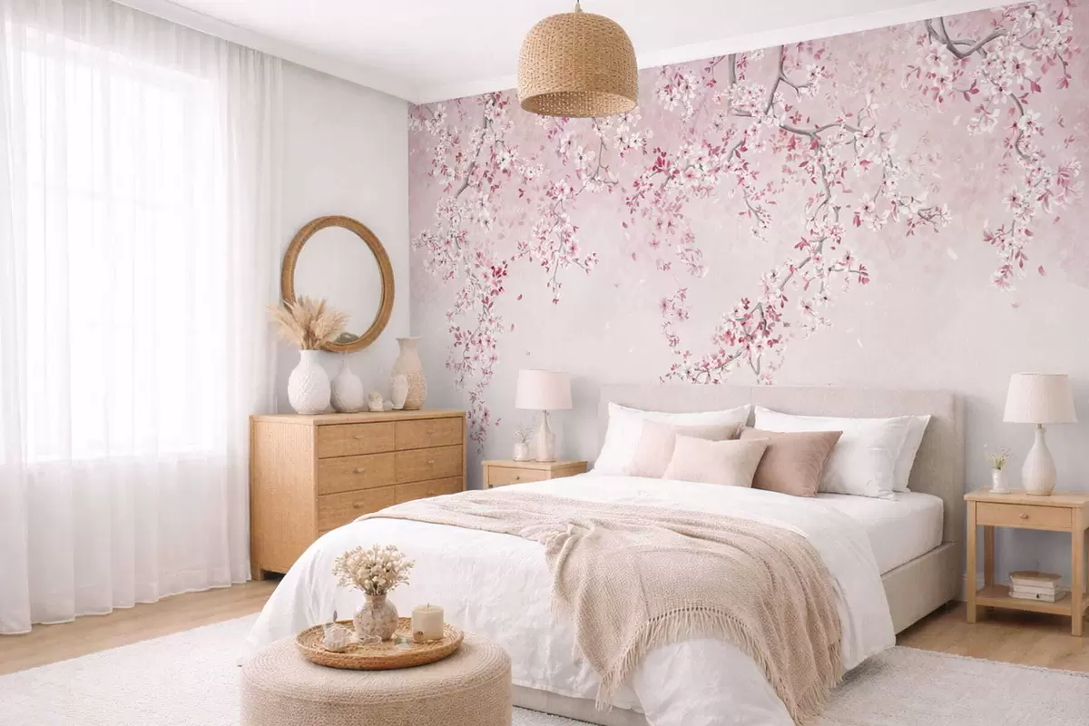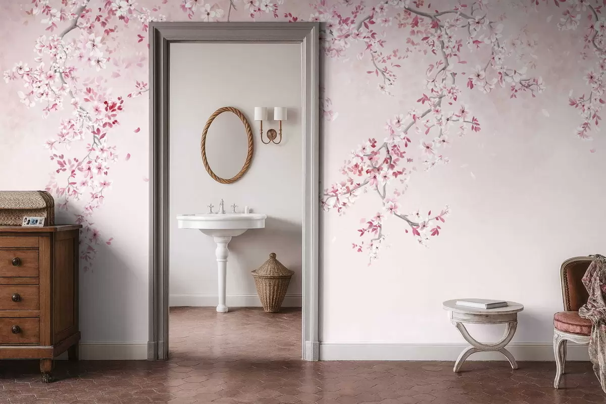 Fototapetak Rózsaszín virágokkal díszített ágak puha pasztell háttér előtt Nr. w05129v1