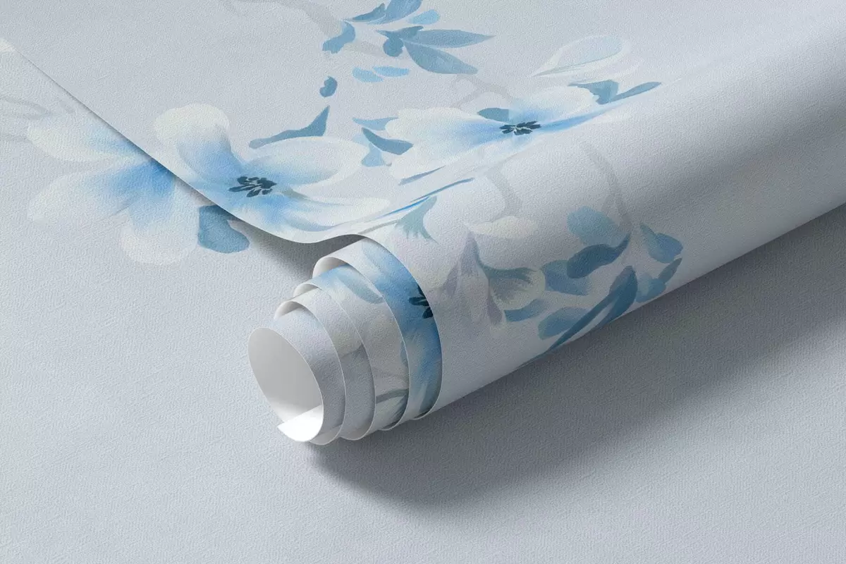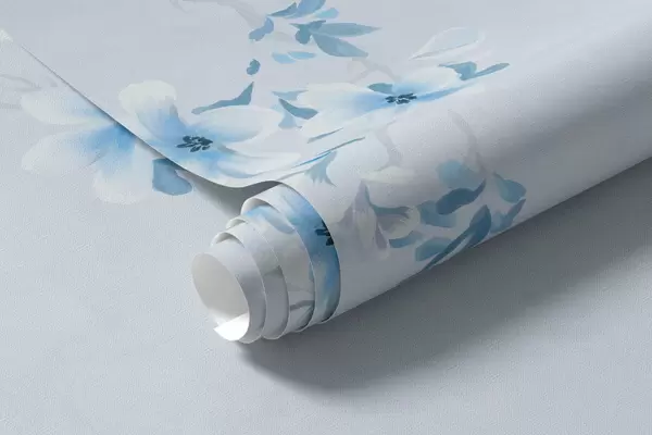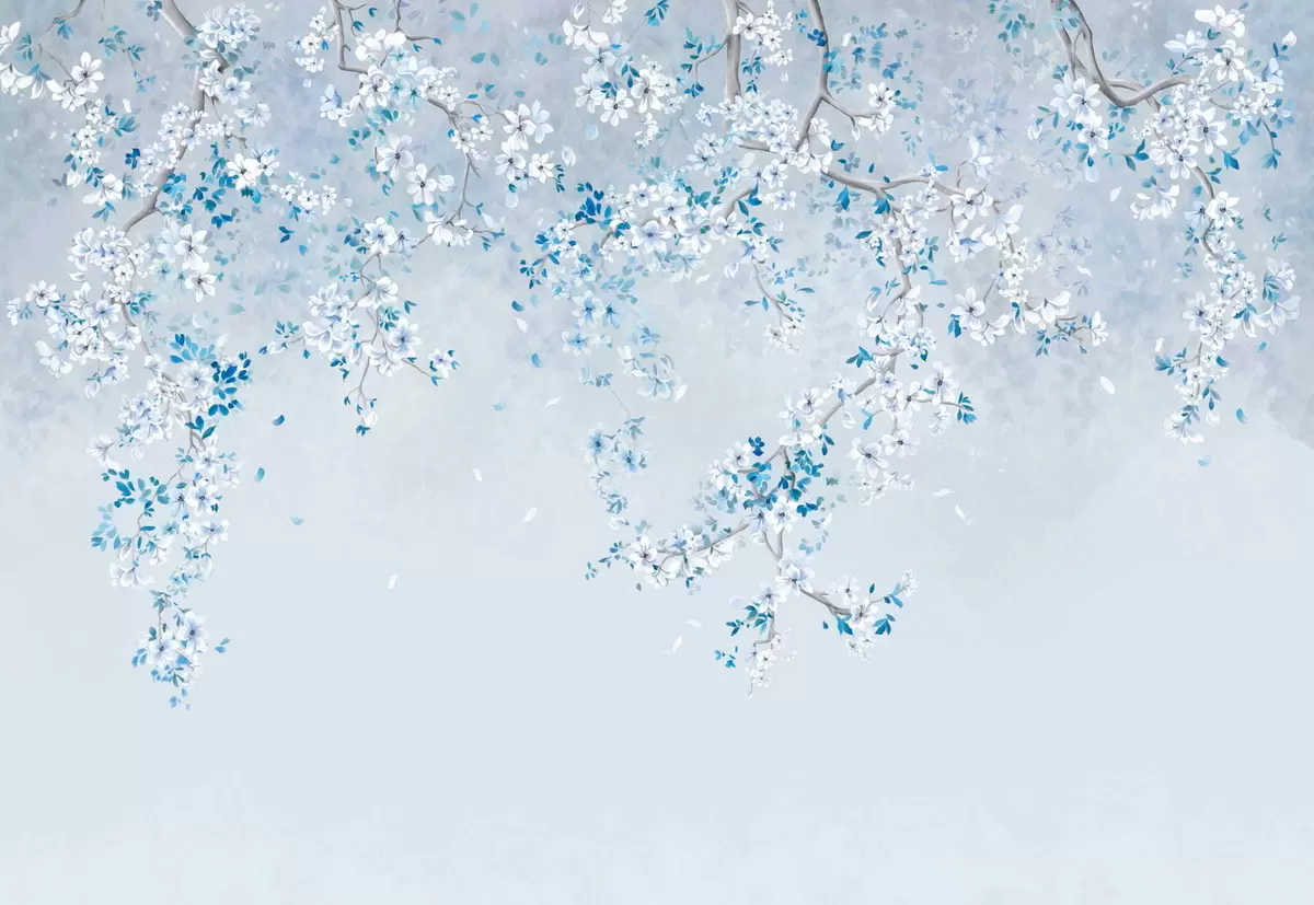 Fototapetak Hűvös háttér előtt fehér és kék virágokkal díszített ágak Nr. w05129v2