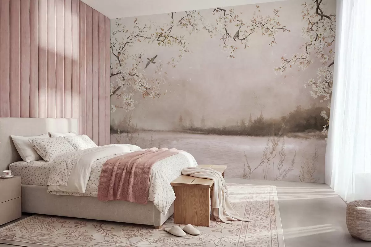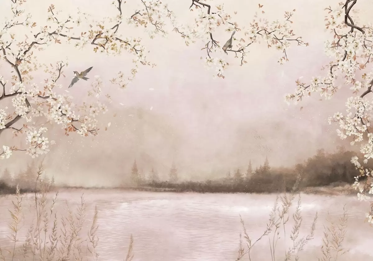 Fototapetak Virágzó ágak a nyugodt tó felett, madarak a ködben Nr. w05155v1