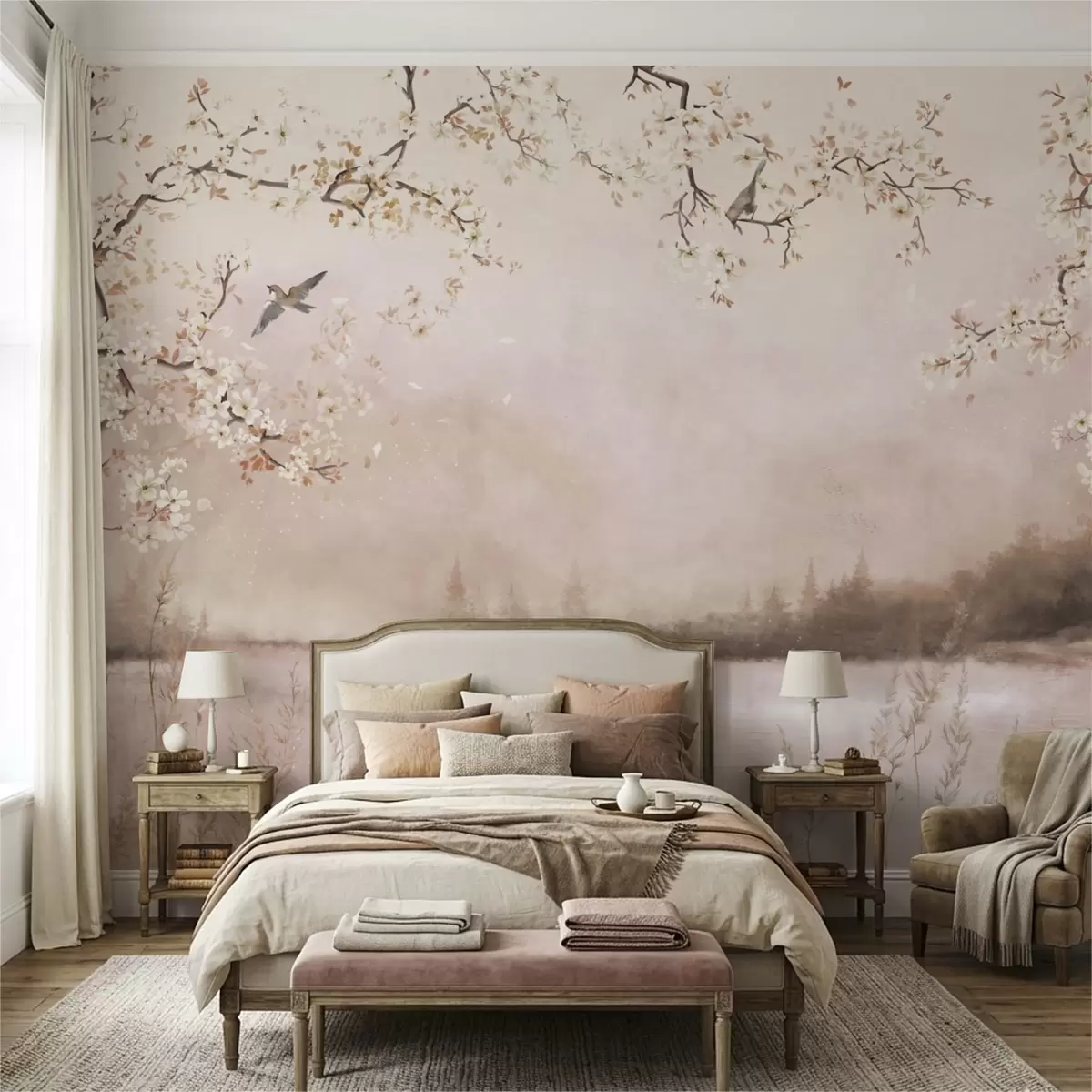 Fototapetak Virágzó ágak a nyugodt tó felett, madarak a ködben Nr. w05155v1
