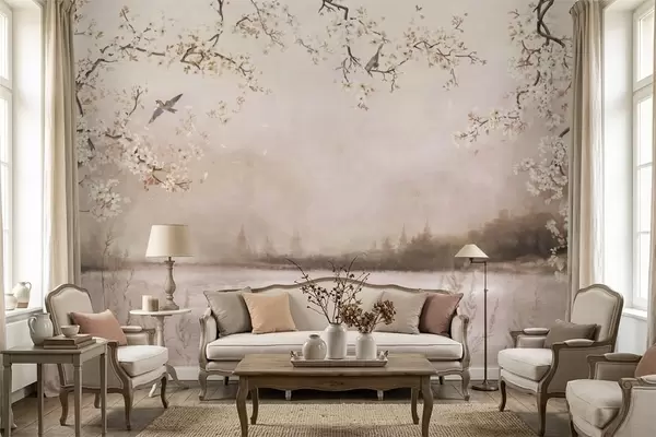Fototapetak Virágzó ágak a nyugodt tó felett, madarak a ködben Nr. w05155v1