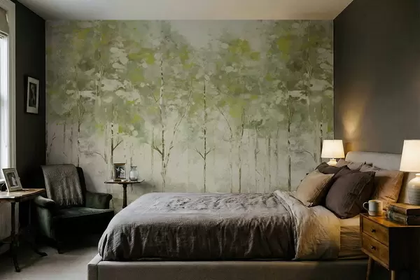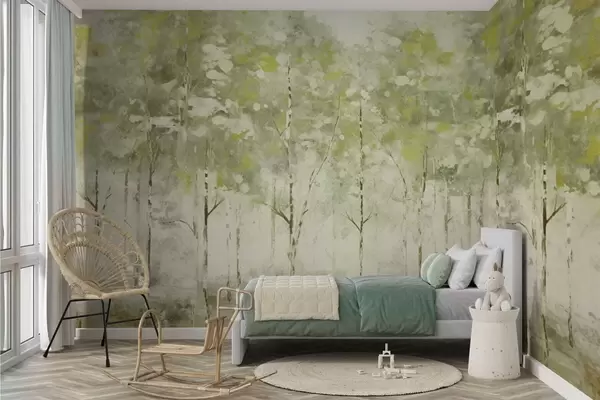 Fototapetak Stilizált erdő karcsú fákkal, zöld árnyalatokban Nr. w05221v1