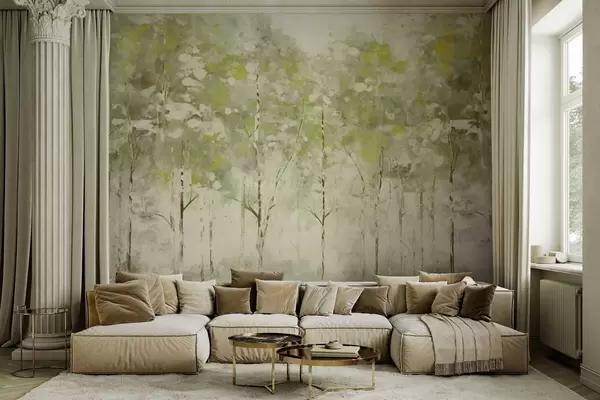 Fototapetak Stilizált erdő karcsú fákkal, zöld árnyalatokban Nr. w05221v1