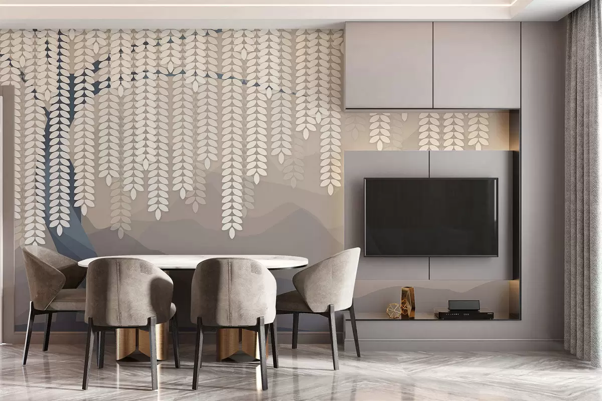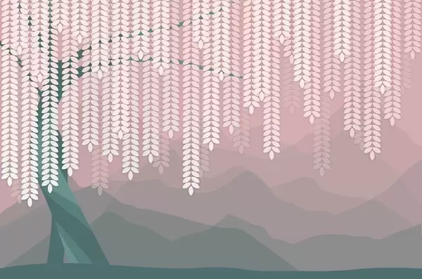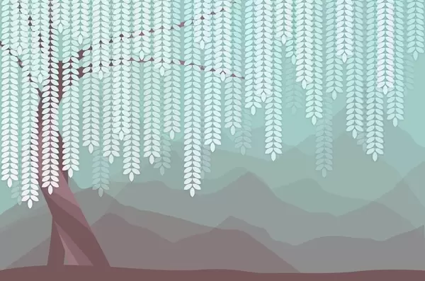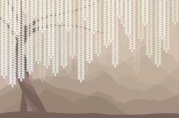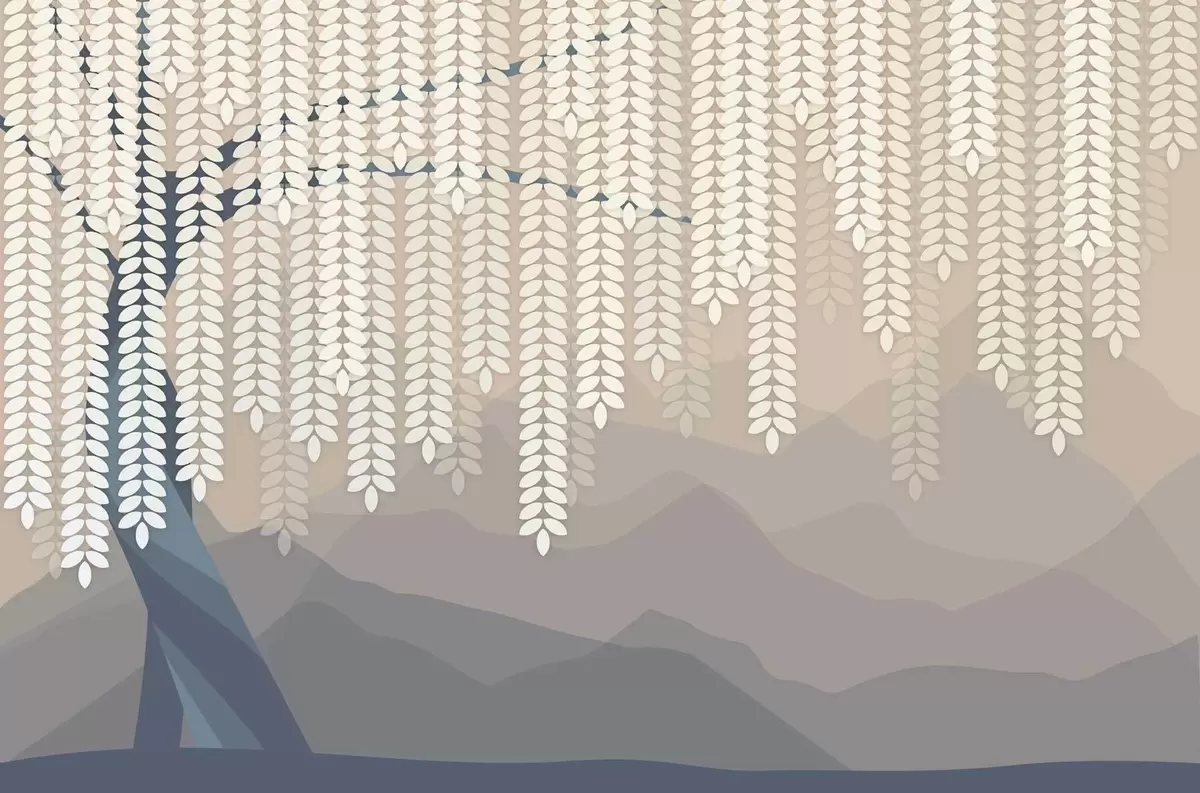 Fototapetak stilizált fűzfa lógó levelekkel, minimalista hegyek háttérében, bézs és kékes-zöld árnyalatokban Nr. w05232