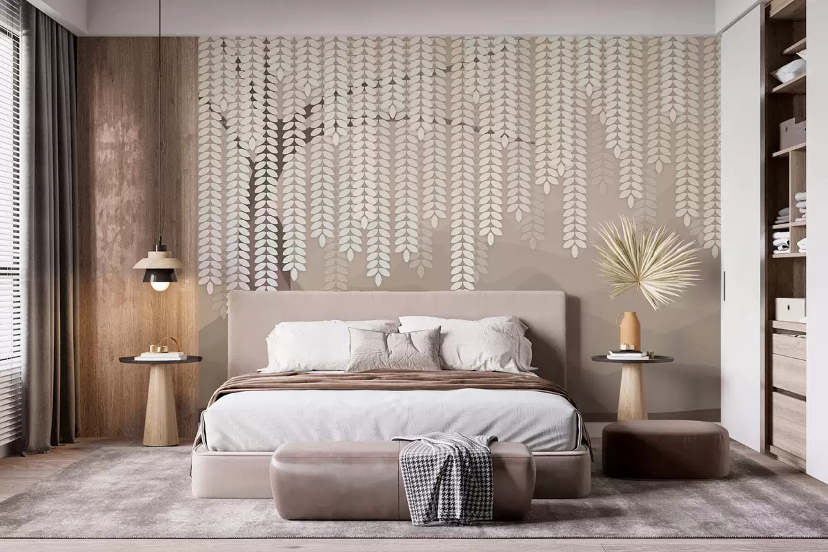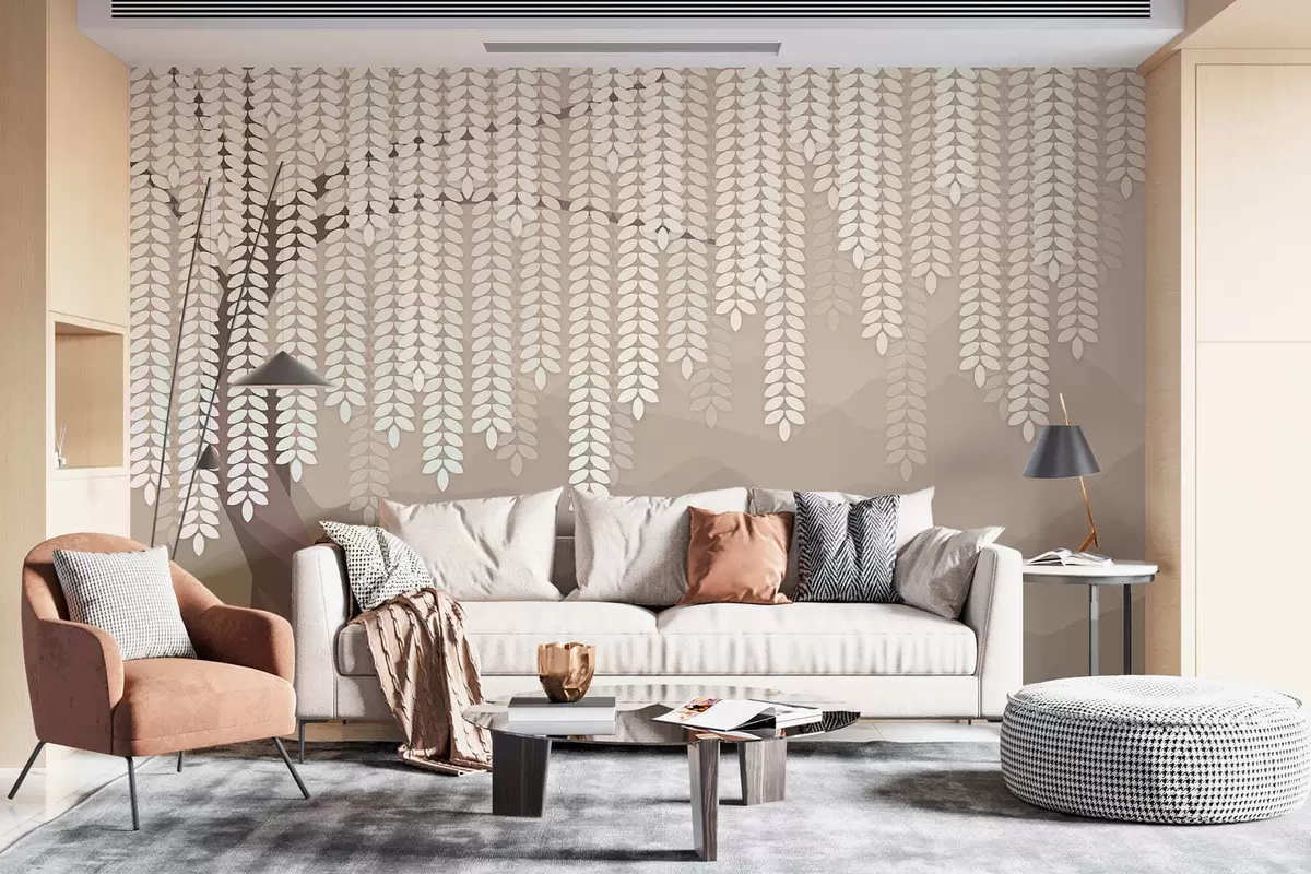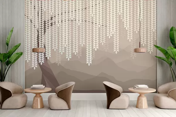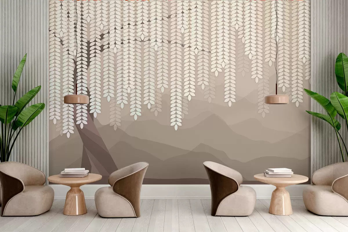 Fototapetak stilizált fűzfa lógó levelekkel, minimalista hegyek háttérében, kávé színárnyalatokban Nr. w05232v2