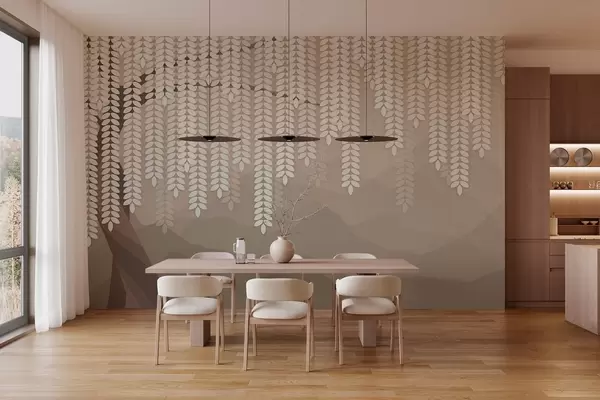 Fototapetak stilizált fűzfa lógó levelekkel, minimalista hegyek háttérében, kávé színárnyalatokban Nr. w05232v2