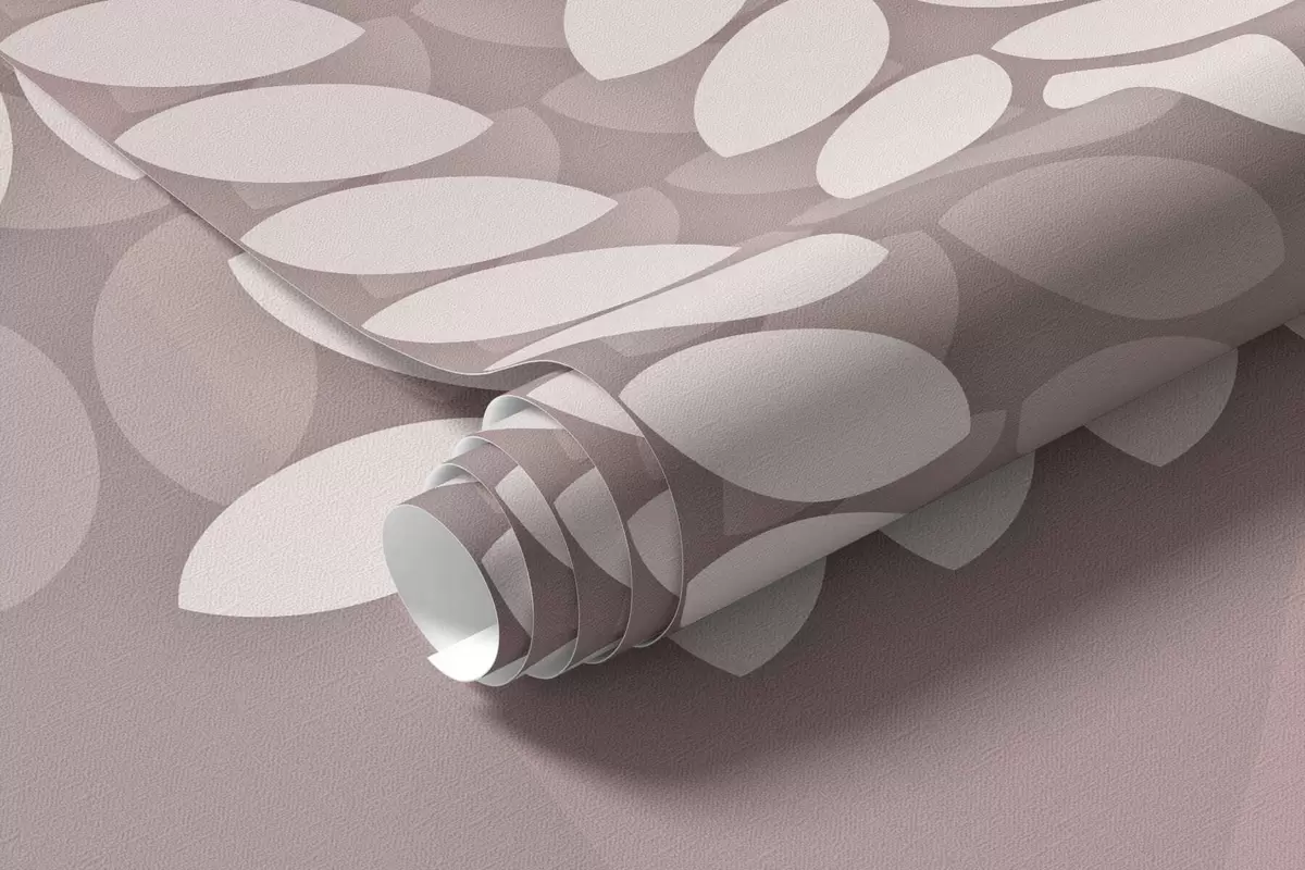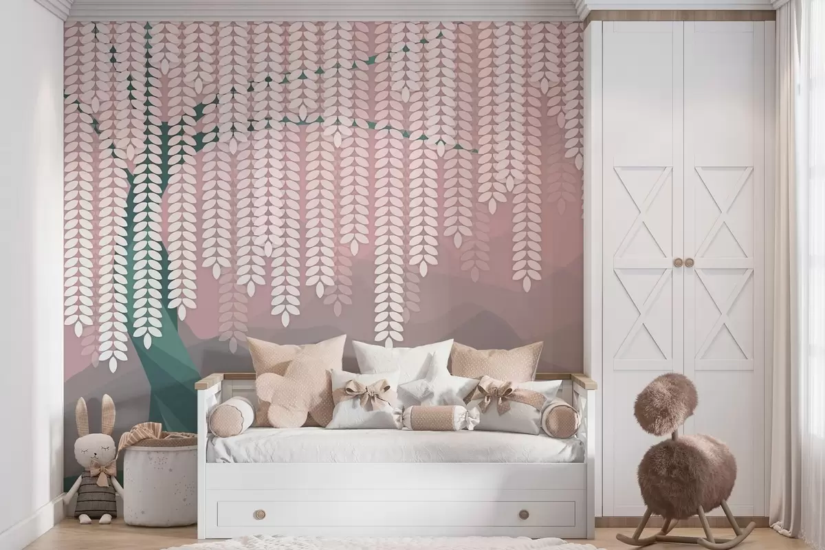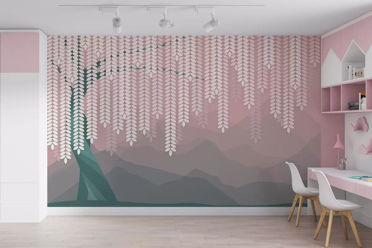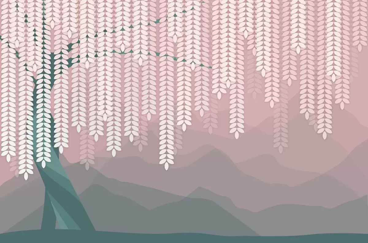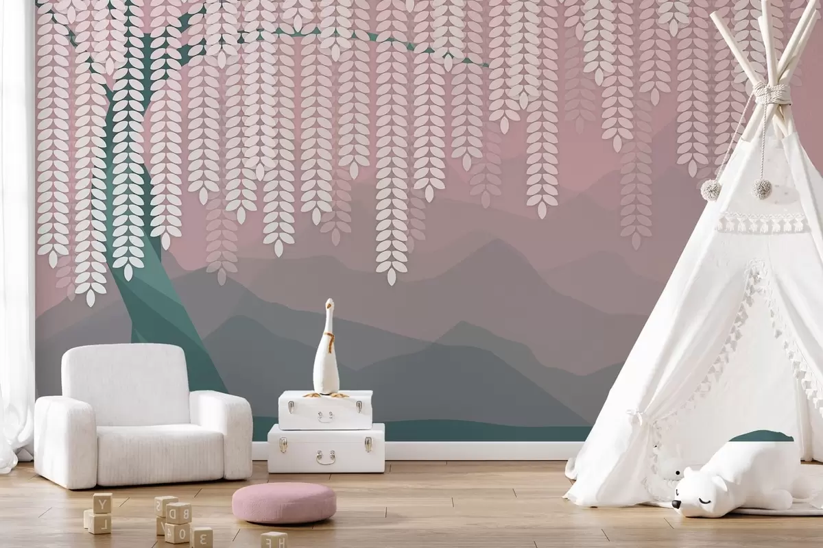 Fototapetak stilizált fűzfa lógó levelekkel, minimalista hegyek háttérében, rózsaszín és sötétzöld árnyalatokban Nr. w05232v4