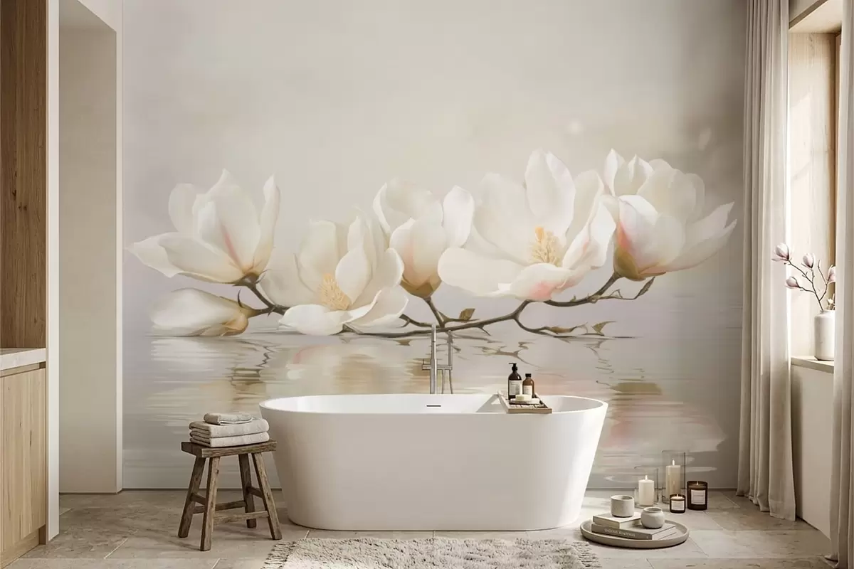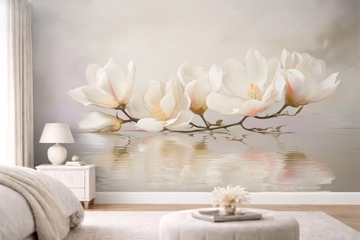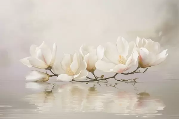 Fototapetak Könnyű magnólia virágok ágon a víz tükröződése felett Nr. w05353