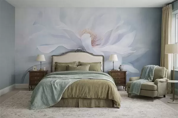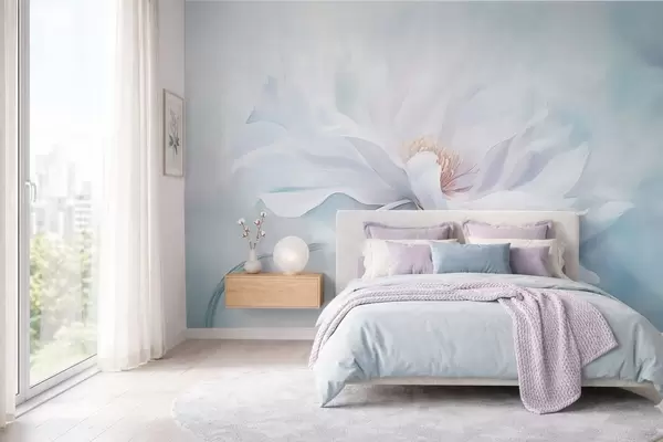 Fototapetak Puha fehér virág, hullámzó szirmokkal, kék háttérrel Nr. w05354