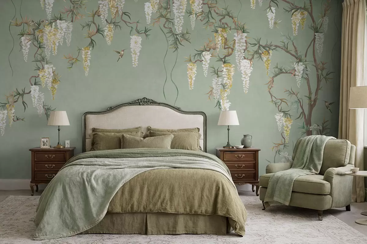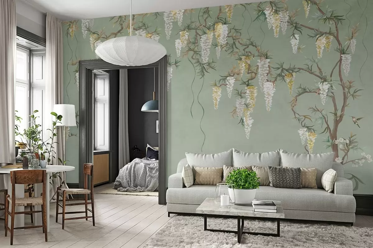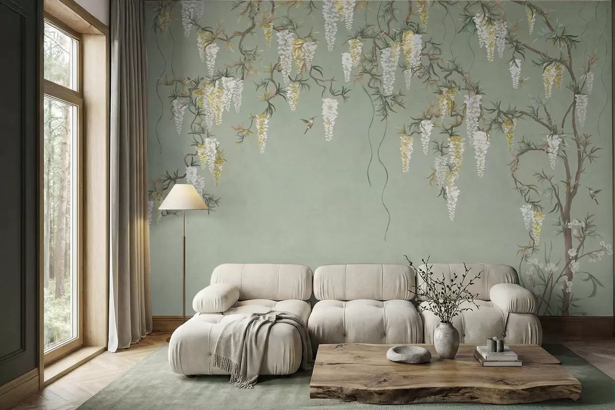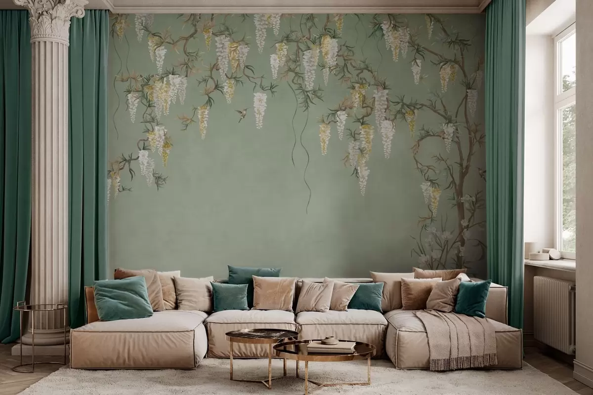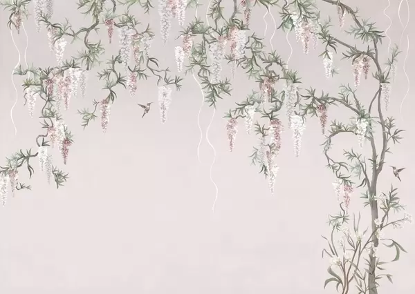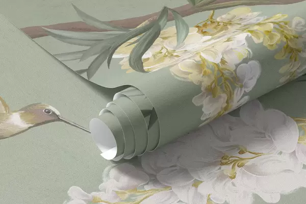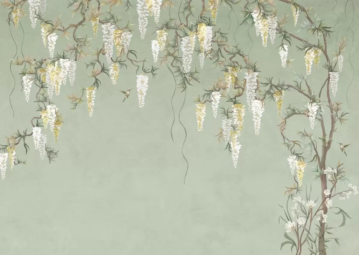 Fototapetak Virágzó ágak fehér virágokkal és madarakkal zöld háttér előtt Nr. w05394