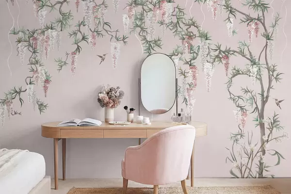 Fototapetak Virágzó ágak rózsaszín virágokkal és madarakkal Nr. w05394v1