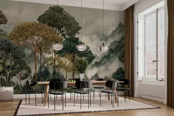 Fototapetak Magas fákkal teli erdő a ködös hegyekben Nr. w05410