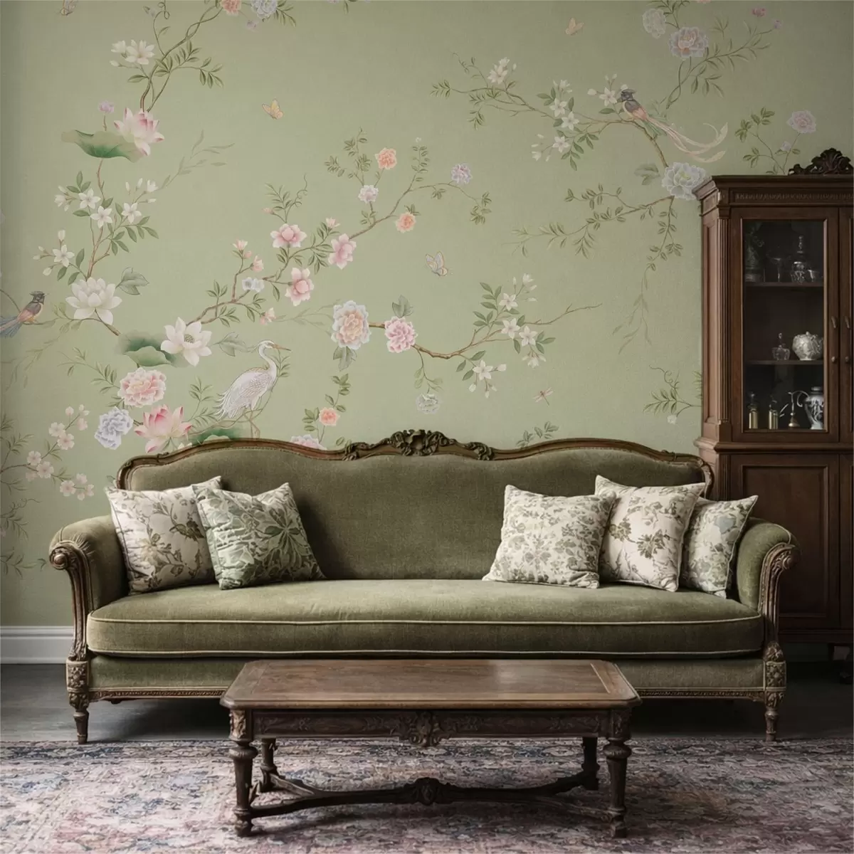 Fototapetak Virágzó ágak madarakkal, világoszöld alapon Nr. w05416