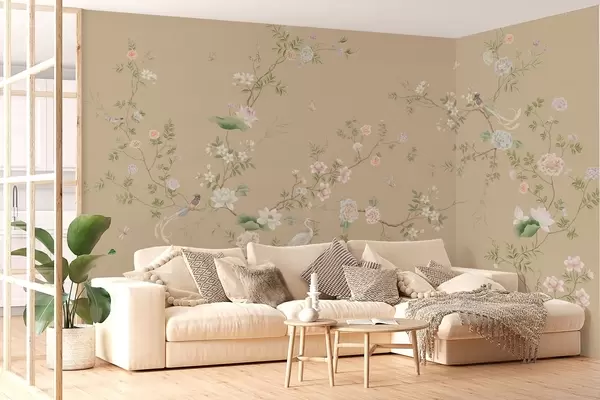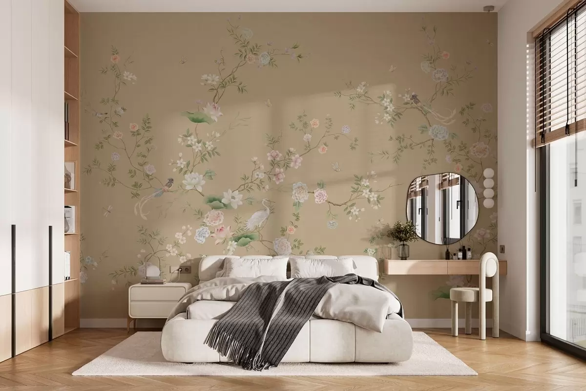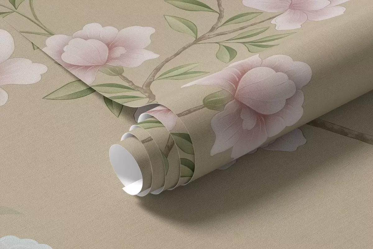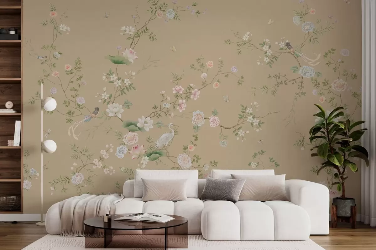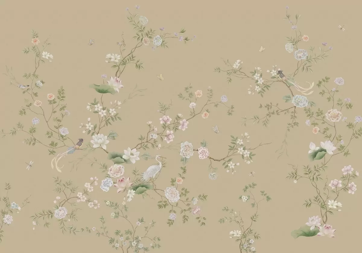 Fototapetak Virágzó ágak madarakkal, meleg bézs alapon Nr. w05416v2